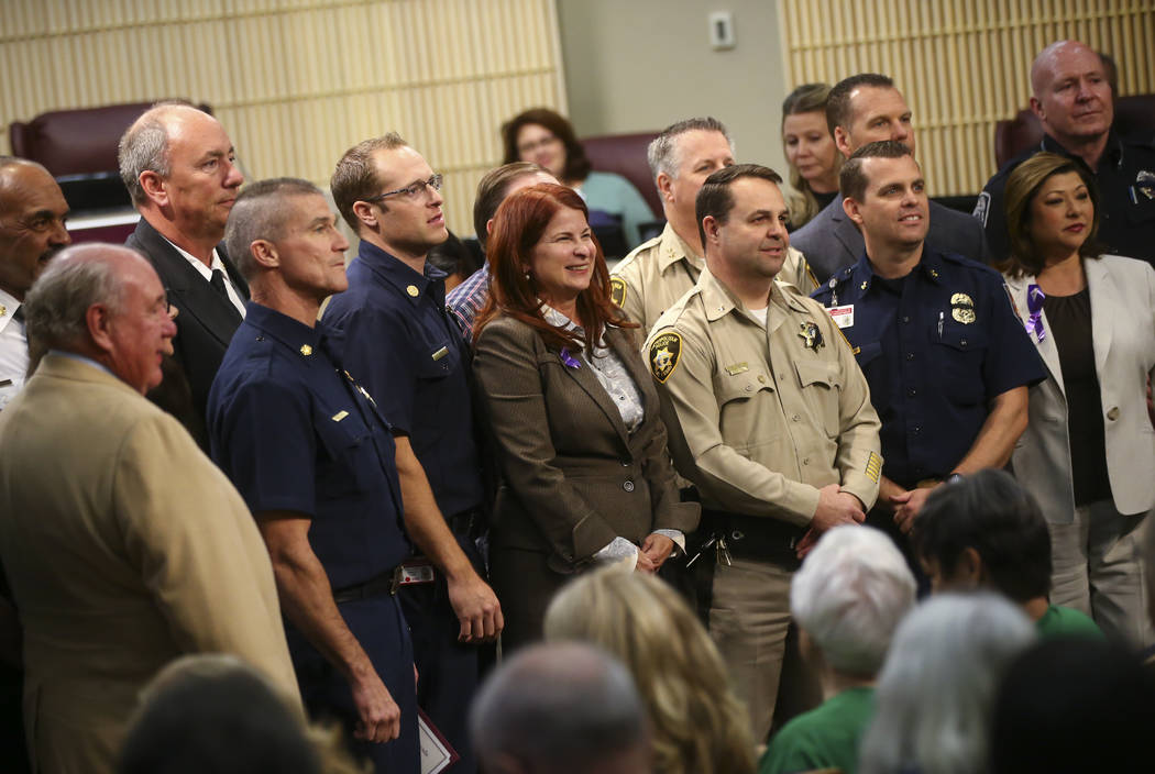Henderson Mayor Debra March, center, poses for a photo with first responders in the Oct. 1 shooting as they are recognized during a Henderson City Council meeting on Tuesday, Oct. 17, 2017. Chase Stevens Las Vegas Review-Journal @csstevensphoto