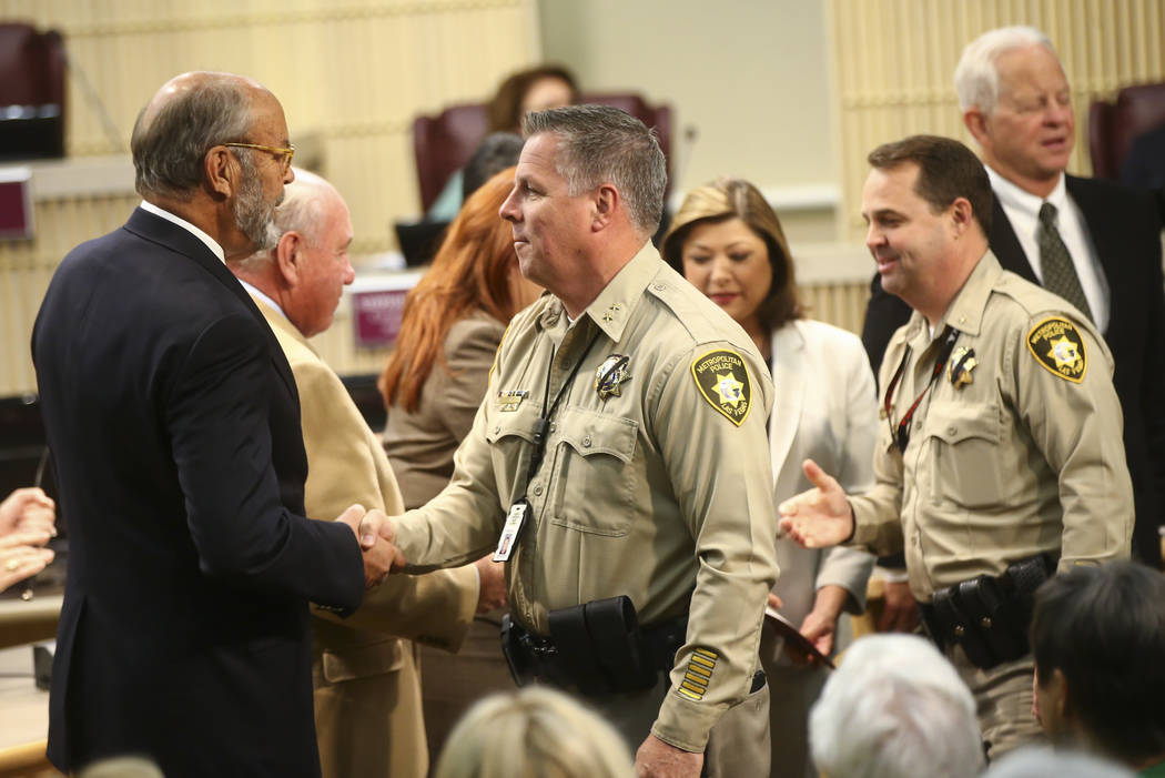 Metropolitan Police Department Assistant Sheriff Todd Fasulo, center, greets Henderson City Councilman John Marz as first responders in the Oct. 1 shooting are recognized during a Henderson City Council meeting on Tuesday, Oct. 17, 2017. Chase Stevens Las Vegas Review-Journal @csstevensphoto