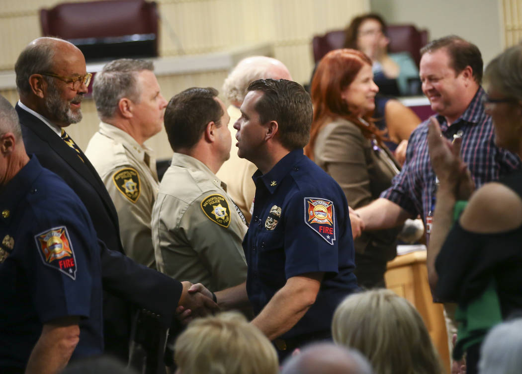 Henderson Fire Department Chief Shawn White, center right, is greeted by Henderson City Councilman Dan Shaw as first responders in the Oct. 1 shooting are recognized during a Henderson City Council meeting on Tuesday, Oct. 17, 2017. Chase Stevens Las Vegas Review-Journal @csstevensphoto