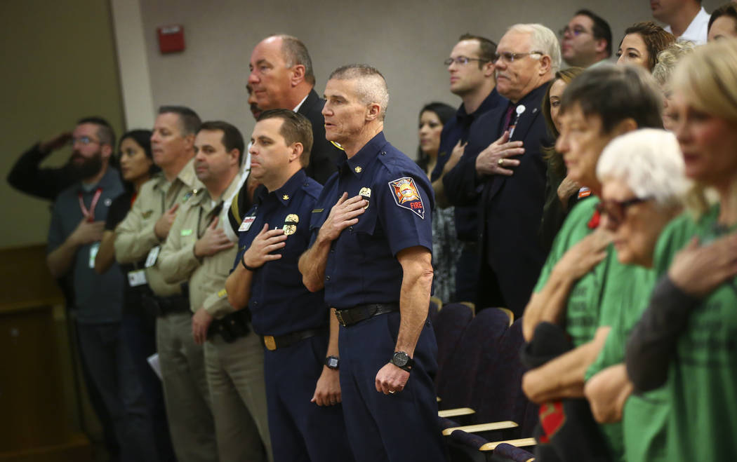 Henderson Fire Department Chief Shawn White, center, during the national anthem with first responders in the Oct. 1 shooting before being honored during a Henderson City Council meeting on Tuesday, Oct. 17, 2017. Chase Stevens Las Vegas Review-Journal @csstevensphoto