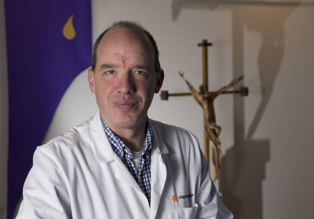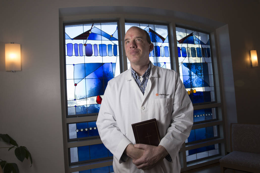 He invites them to pray, or asks if patients would like him to share a blessing. If need be, he connects family with counseling services. Either way, he is usually leading the conversation.