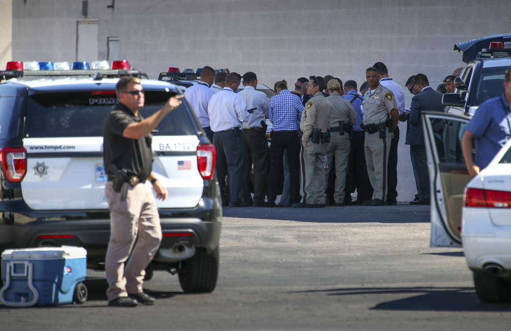 Metropolitan Police and detectives meet at the perimeter of a scene as they investigate an officer-involved shooting that occurred in a strip mall near Jones Boulevard and U.S. Highway 95 on Thursday, Sept. 28, 2017, in Las Vegas. Richard Brian Las Vegas Review-Journal @vegasphotograph