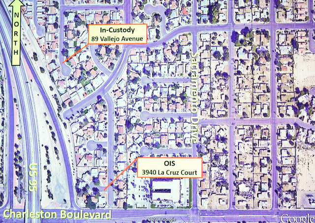Hinckley and his partner attempted to pull over Prichard’s car for not having a license plate near North Nellis Boulevard and East Bonanza Road, but the vehicle sped off. The vehicle did not have its lights on. Officers did not pursue it with lights and sirens but kept a short distance away and tracked the car’s movements.