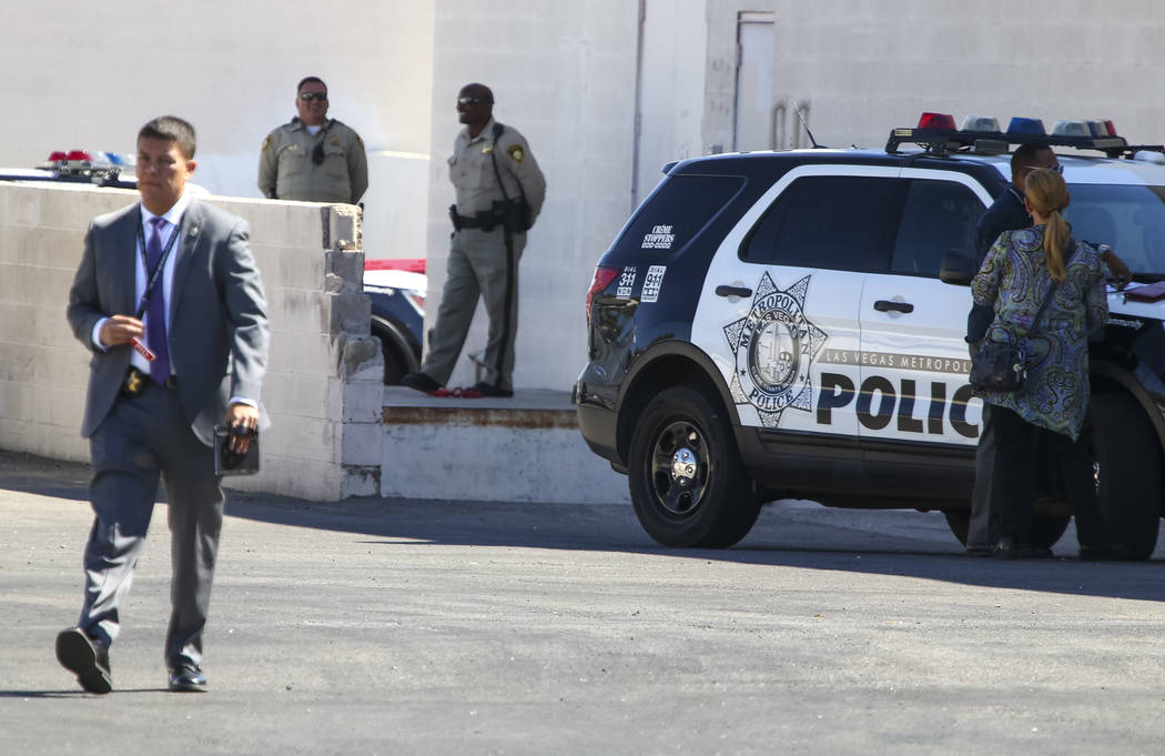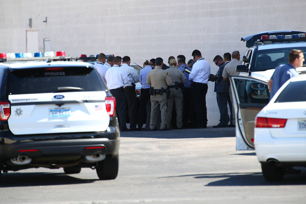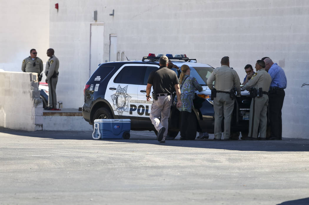 Metropolitan Police and detectives meet at the perimeter of a scene as they investigate an officer-involved shooting that occurred in a strip mall near Jones Boulevard and U.S. Highway 95 on Thursday, Sept. 27, 2017, in Las Vegas. Richard Brian Las Vegas Review-Journal @vegasphotograph