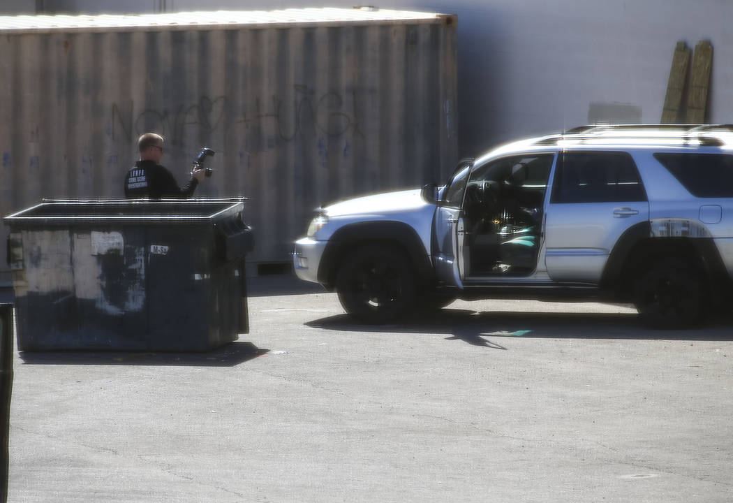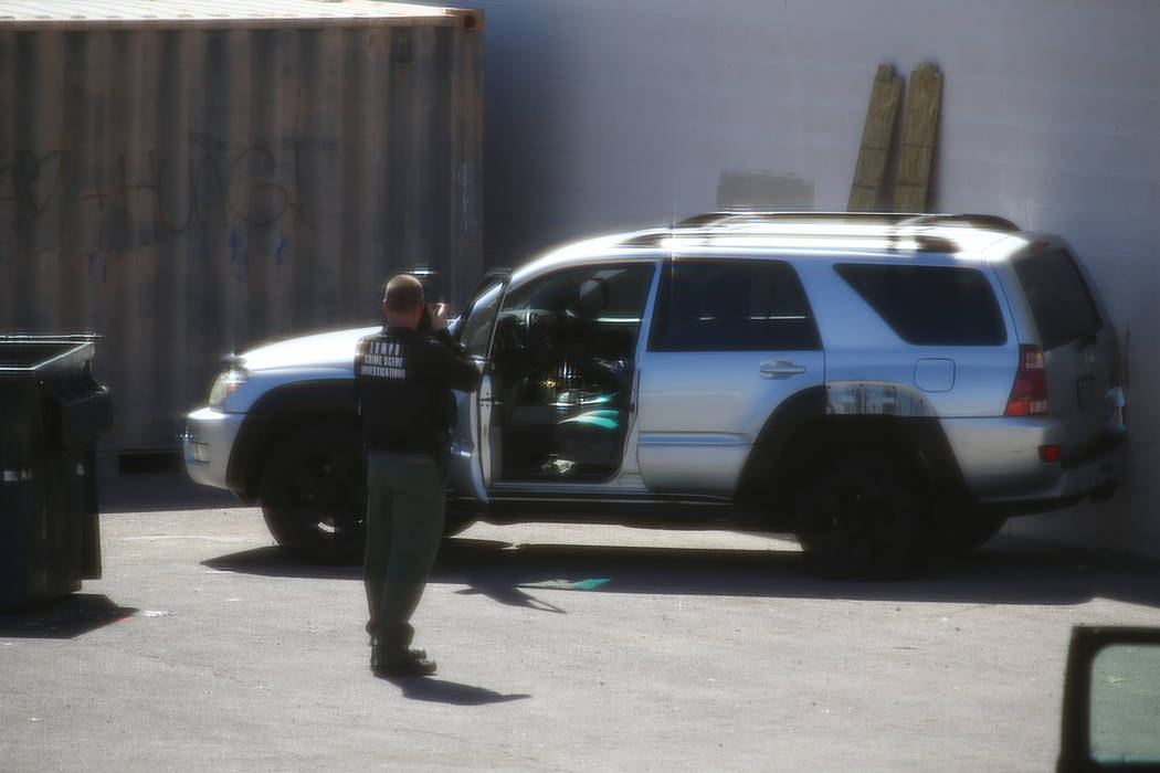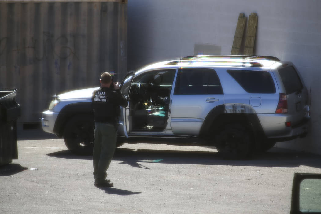 A crime scene investigator collects photos at the scene of an officer-involved shooting that occurred in a strip mall near Jones Boulevard and U.S. Highway 95 on Thursday, Sept. 27, 2017, in Las Vegas. Richard Brian Las Vegas Review-Journal @vegasphotograph