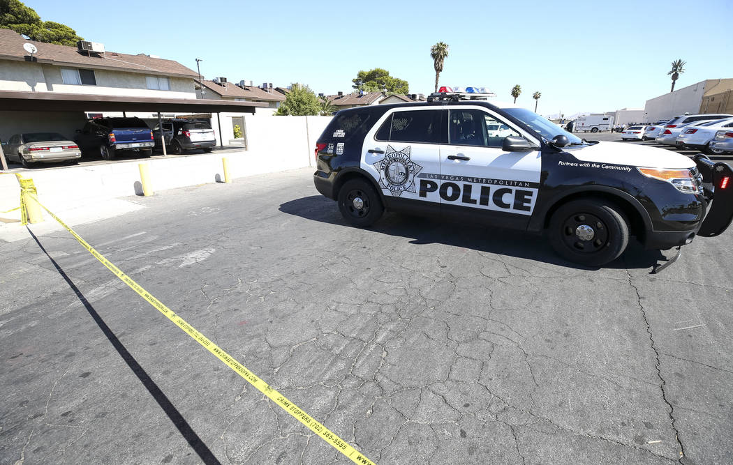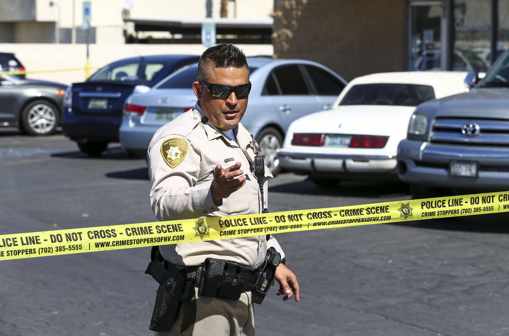 Metropolitan Police Department cordon off the scene as they investigate an officer-involved shooting that occurred in a strip mall near Jones Boulevard and U.S. Highway 95 on Thursday, Sept. 27, 2017, in Las Vegas. Richard Brian Las Vegas Review-Journal @vegasphotograph