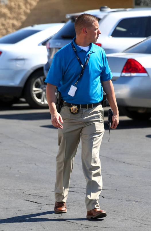 A Metropolitan police officer keeps an eye on the media as they investigate an officer-involved shooting that occurred in a strip mall near Jones Boulevard and U.S. Highway 95 on Thursday, Sept. 27, 2017, in Las Vegas. Richard Brian Las Vegas Review-Journal @vegasphotograph