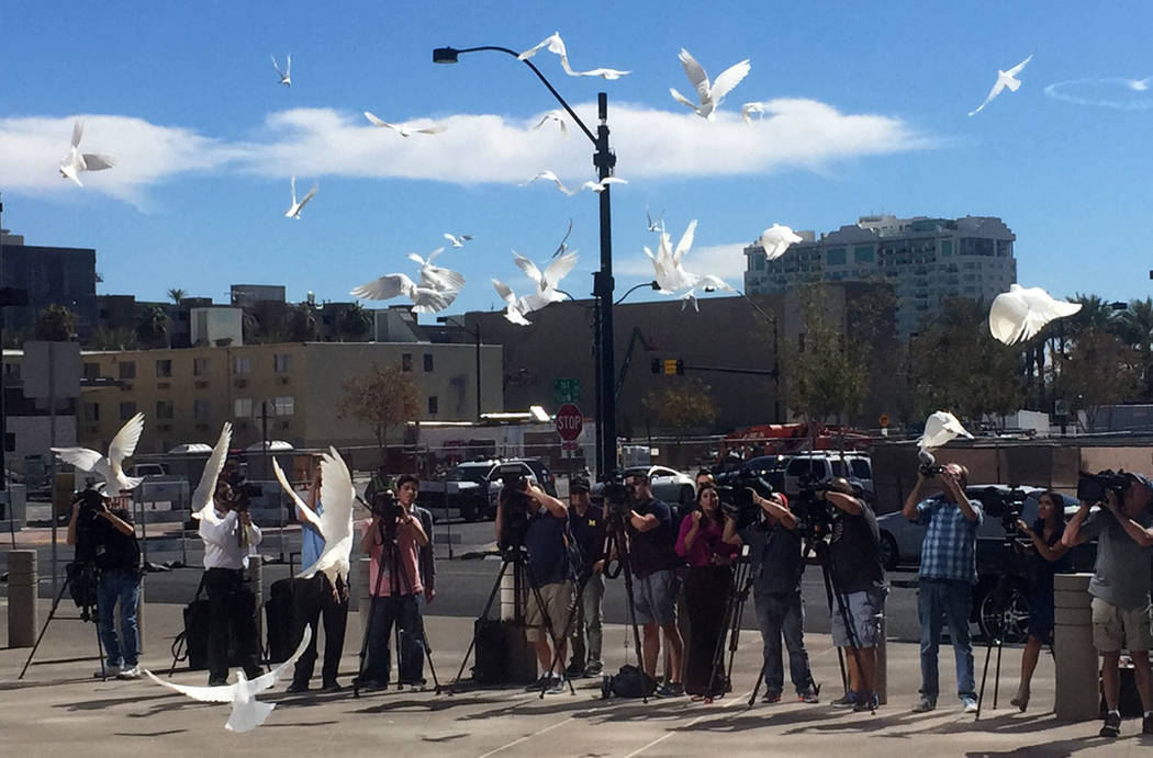 Outside City Hall Saturday, 58 doves were released from their cages, each one representing a person who was killed Sunday night.
