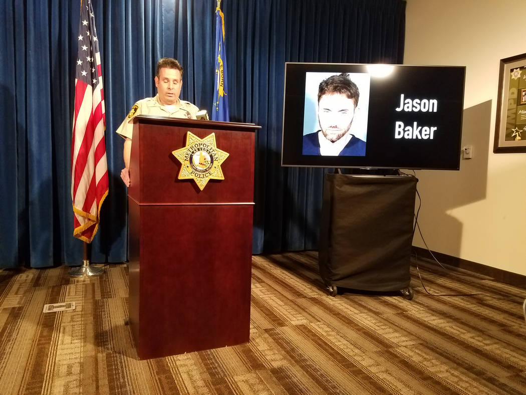 The detective, Travis Linder, was one of several conducting a stakeout of Jason Henry Baker’s apartment at 8530 W. Sahara Ave., Metropolitan Police Department Assistant Sheriff Brett Zimmerman said at a Tuesday news conference.