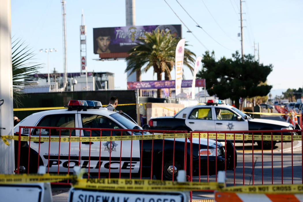 Las Vegas police cars guard the Route 91 Harvest Festival grounds in Las Vegas on Saturday, Oct. 7, 2017, while the FBI collects belongings left by those who attended the festival the night of the shooting. (Elizabeth Brumley/Las Vegas Review-Journal) @EliPagePhoto