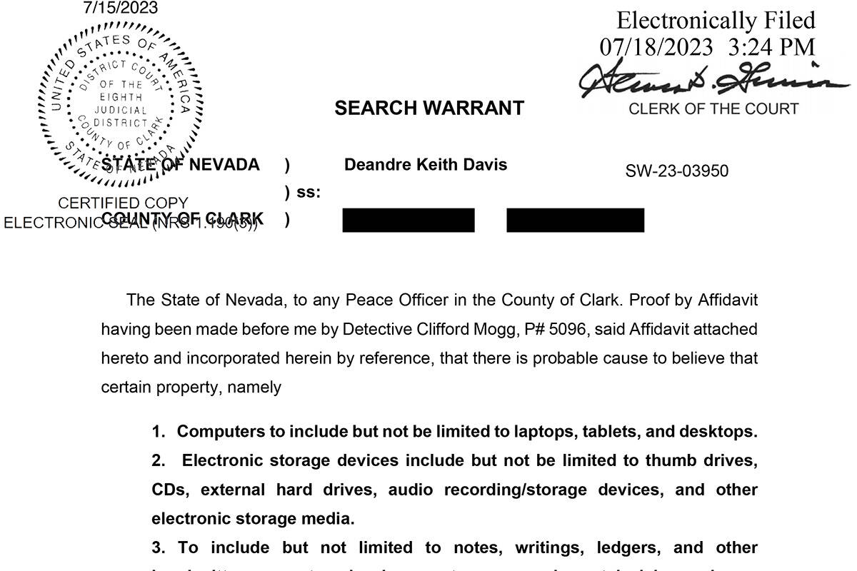 The document, which also names Davis as Deandre Keith Davis, reveals that Las Vegas police sought “photos, movies, CDs, writing or other documentation showing Duane Keith Davis a.k.a ‘Keefy D’ or ‘Keffe D’ involvement with the Southside Compton Crips.”