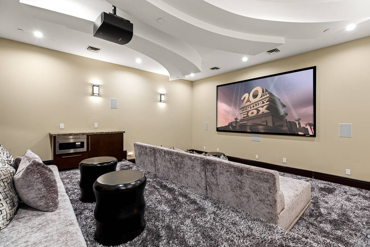 The five-bed, seven-bath home offers a five-car underground garage with a carport capable of accommodating up to seven additional vehicles. It also boasts several bonus areas, including two family rooms, an attached casita, a theater with stadium seating and a game room or office space.