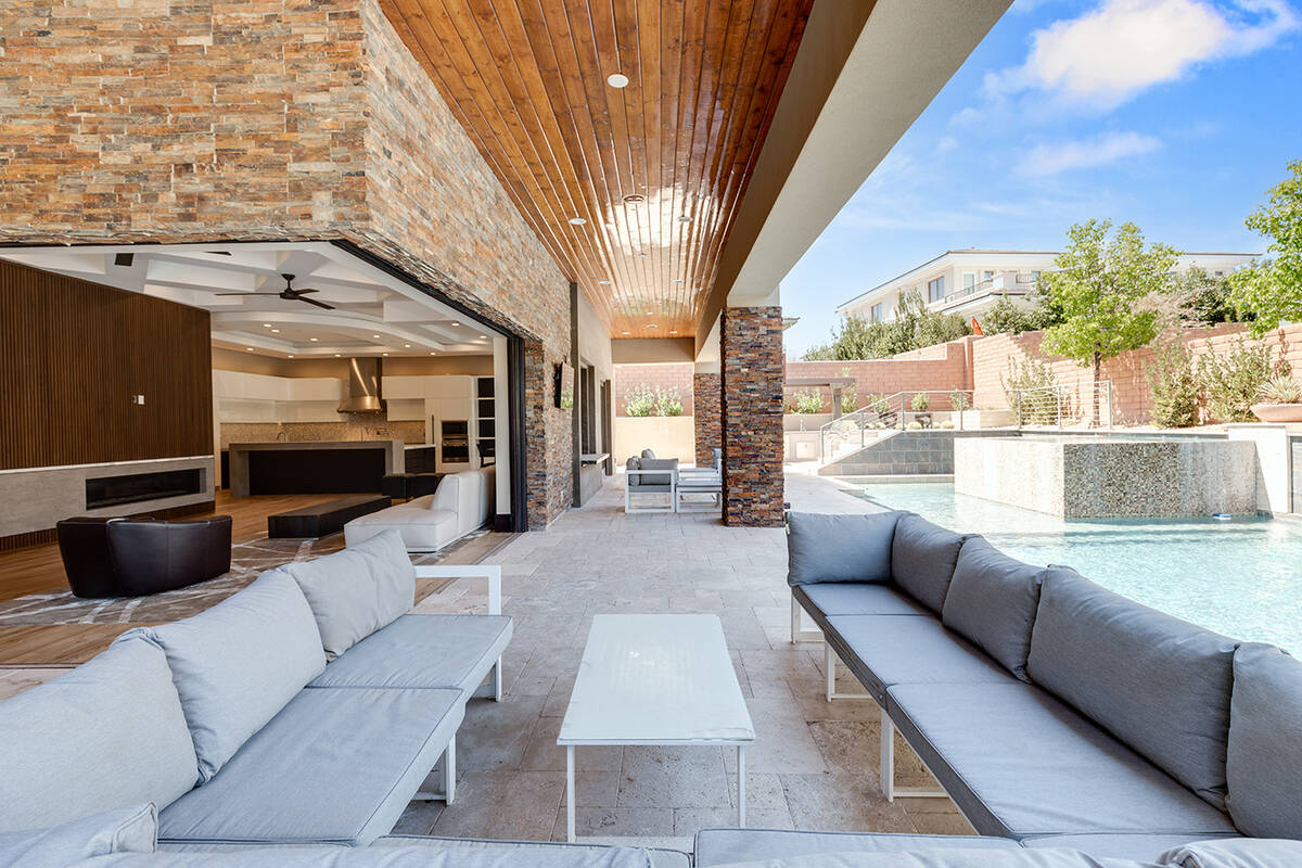 The outdoor space is equally impressive, featuring a covered patio, a pizza oven, a sunken seating area and a pool with a wet deck. Umbrella sleeves supply shade, and built-in bar stools in the pool add convenience and luxury.