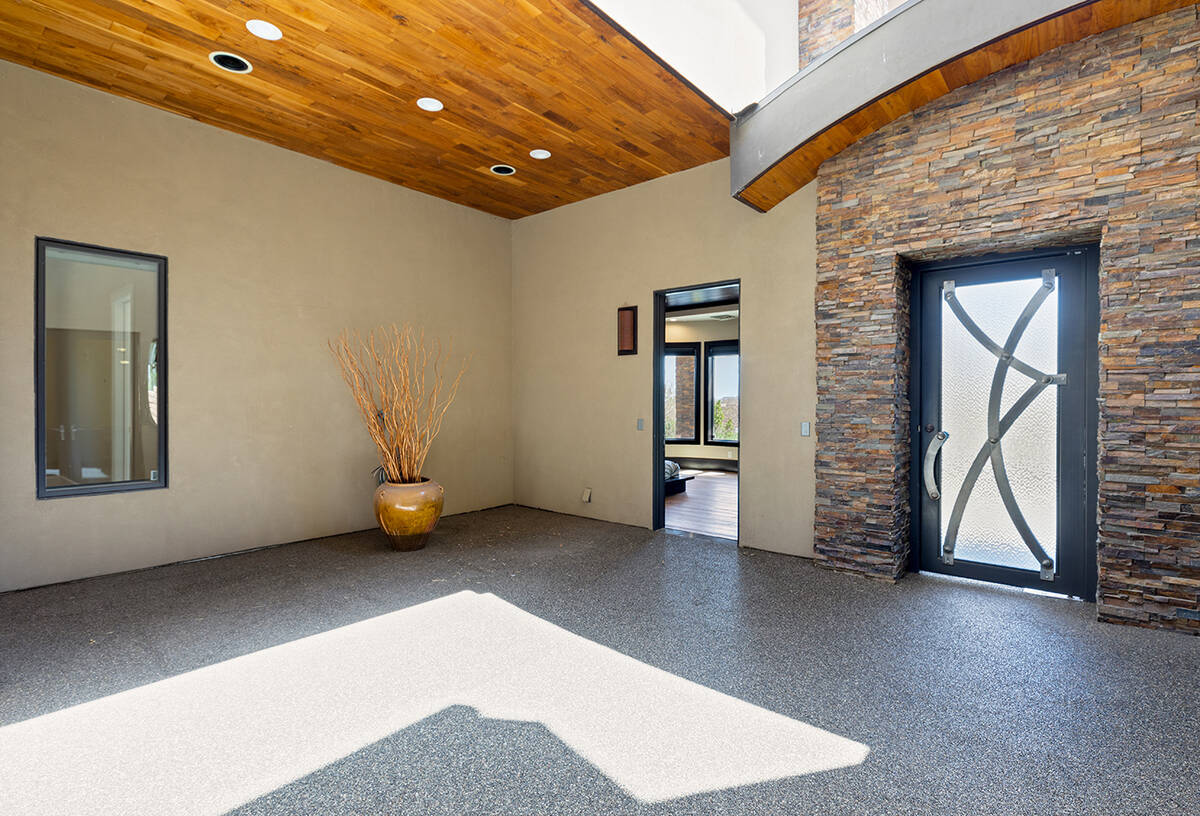 Through the remote-operated electric gate, residents are greeted by a courtyard with access to the casita and the main entryway. Upon entering, the home showcases intricate custom ceiling designs in each room.