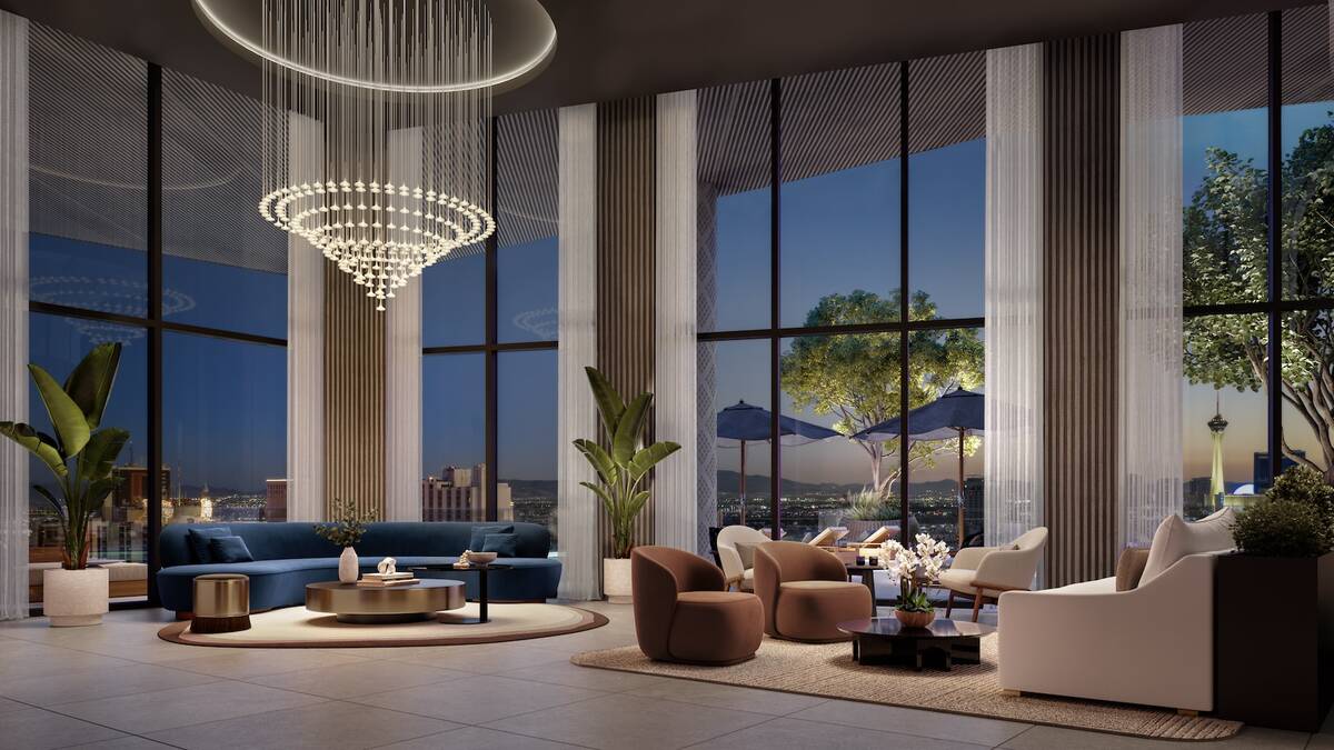 Cello Tower features more than 40,000 square feet of amenities across three floors, including 25,000 square feet of indoor-outdoor lifestyle spaces on the building’s seventh floor. The elevated outdoor environment features an expansive resident lounge with exhibition kitchen and private dining room, TV media wall, a hyper-oxygenated resort-style pool with panoramic views of the Las Vegas skyline, a pet spa and park, barbecue areas, an entertainment kitchen and lush parklike landscaping. A 7,000-square-foot wellness floor includes a full-scale health and wellness club with a functional training area, personal training, cold plunge, massage and treatment rooms and sauna and steam rooms. Additionally, there are private workspaces, conference rooms, a golf simulator, a game room and an outdoor cigar lounge with mountain views. An exclusive arrival experience includes private entry and valet, private parking and 24-hour security and surveillance.