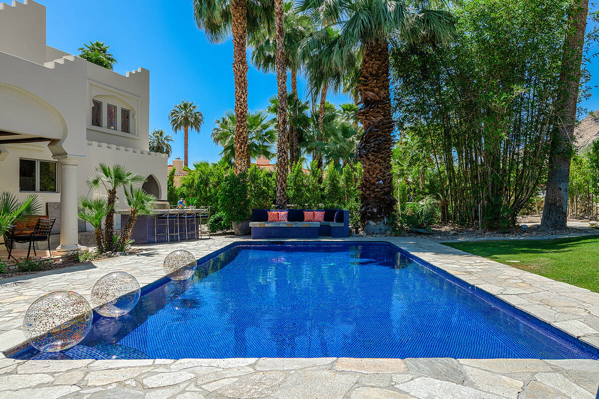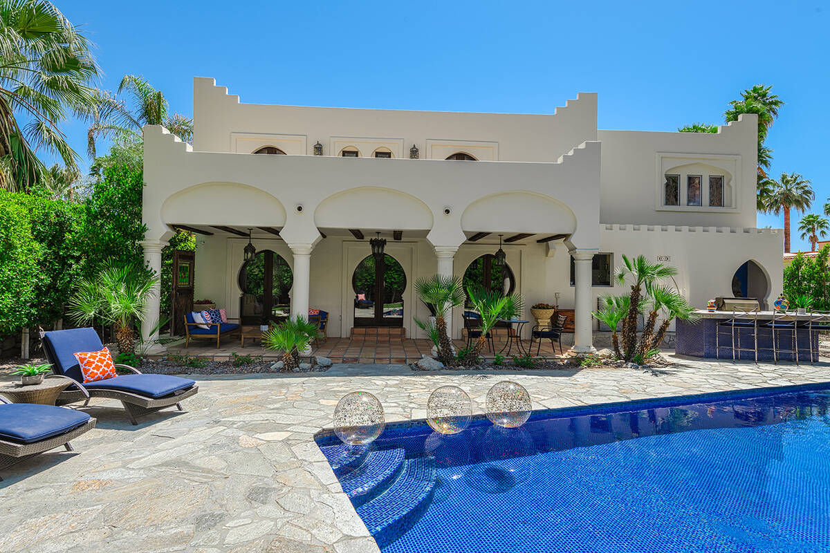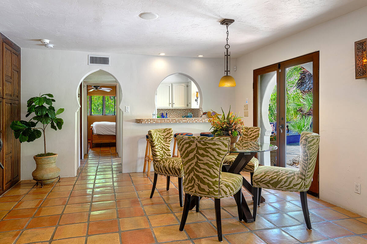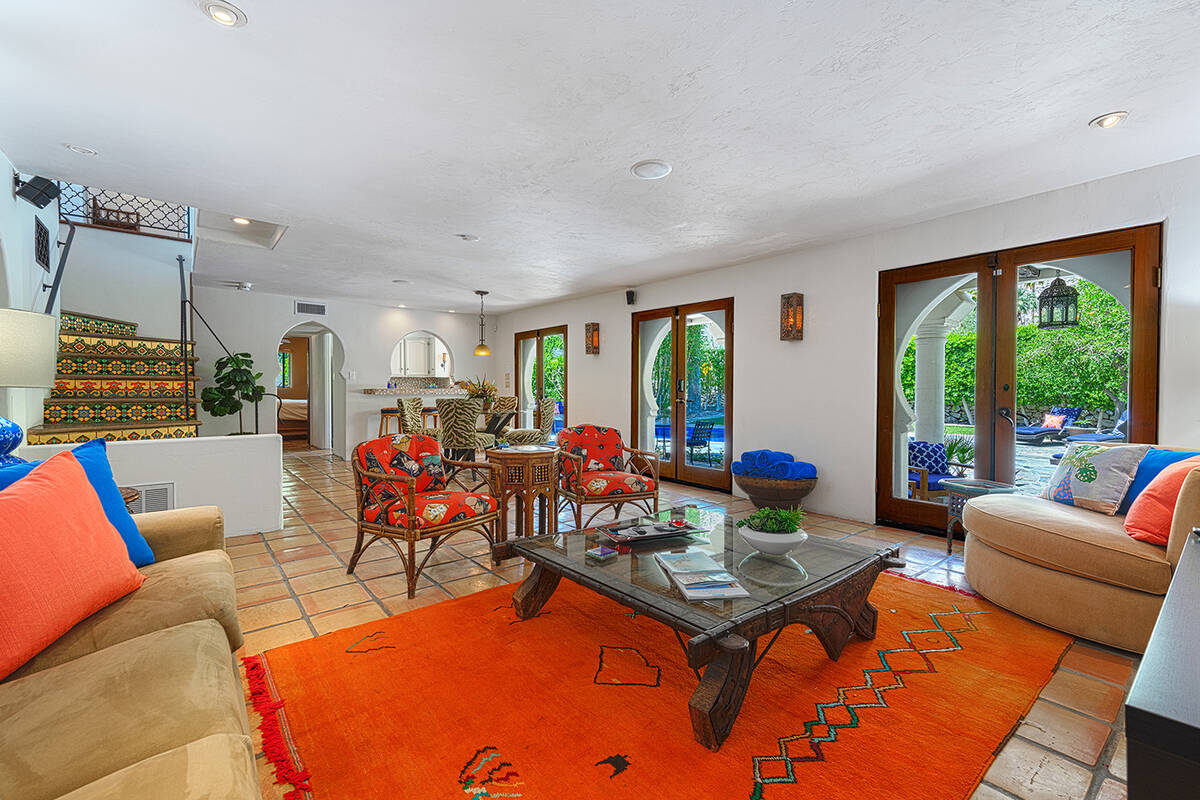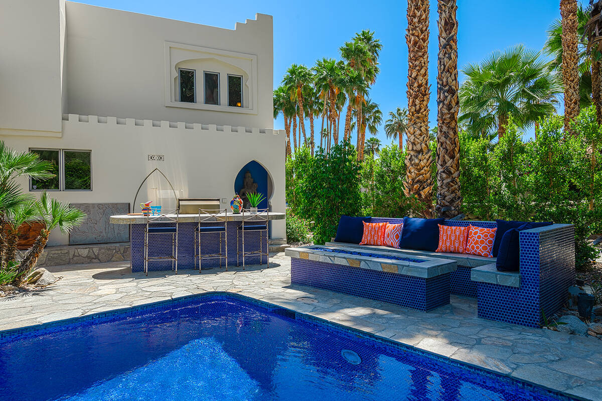 Situated on roughly a quarter-acre lot, the home underwent substantial improvements in the 1950s, upgrading and expanding the indoor living quarters while giving it a Moroccan-inspired facelift with Moorish-inspired accents throughout. The estate features four bedrooms, four baths, a three-car garage, two kitchens, an attached casita, multilevel patios and a resort-style yard.