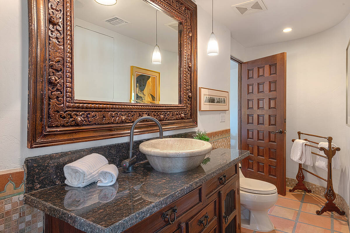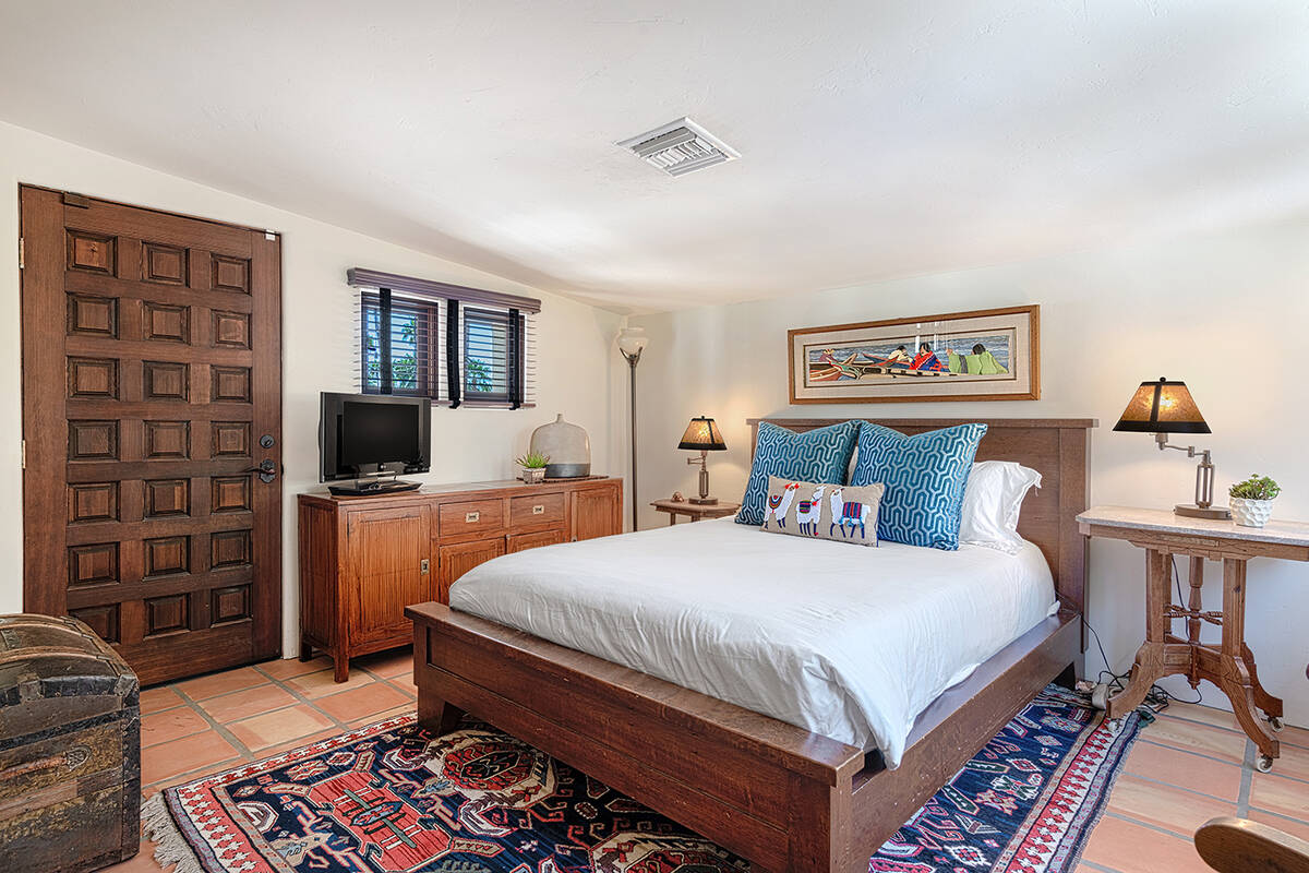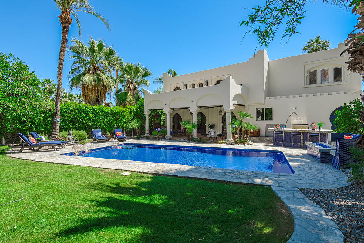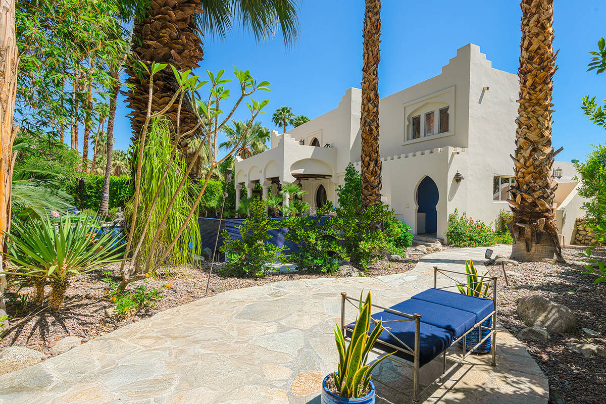 Situated on roughly a quarter-acre lot, the home underwent substantial improvements in the 1950s, upgrading and expanding the indoor living quarters while giving it a Moroccan-inspired facelift with Moorish-inspired accents throughout. The estate features four bedrooms, four baths, a three-car garage, two kitchens, an attached casita, multilevel patios and a resort-style yard.
