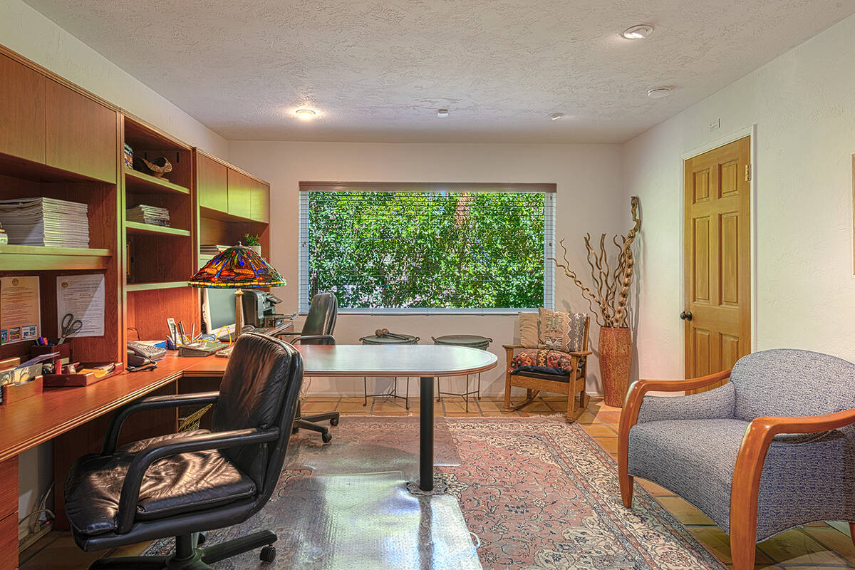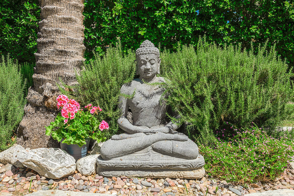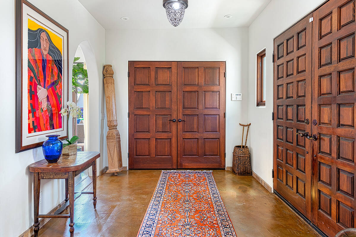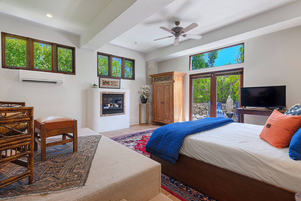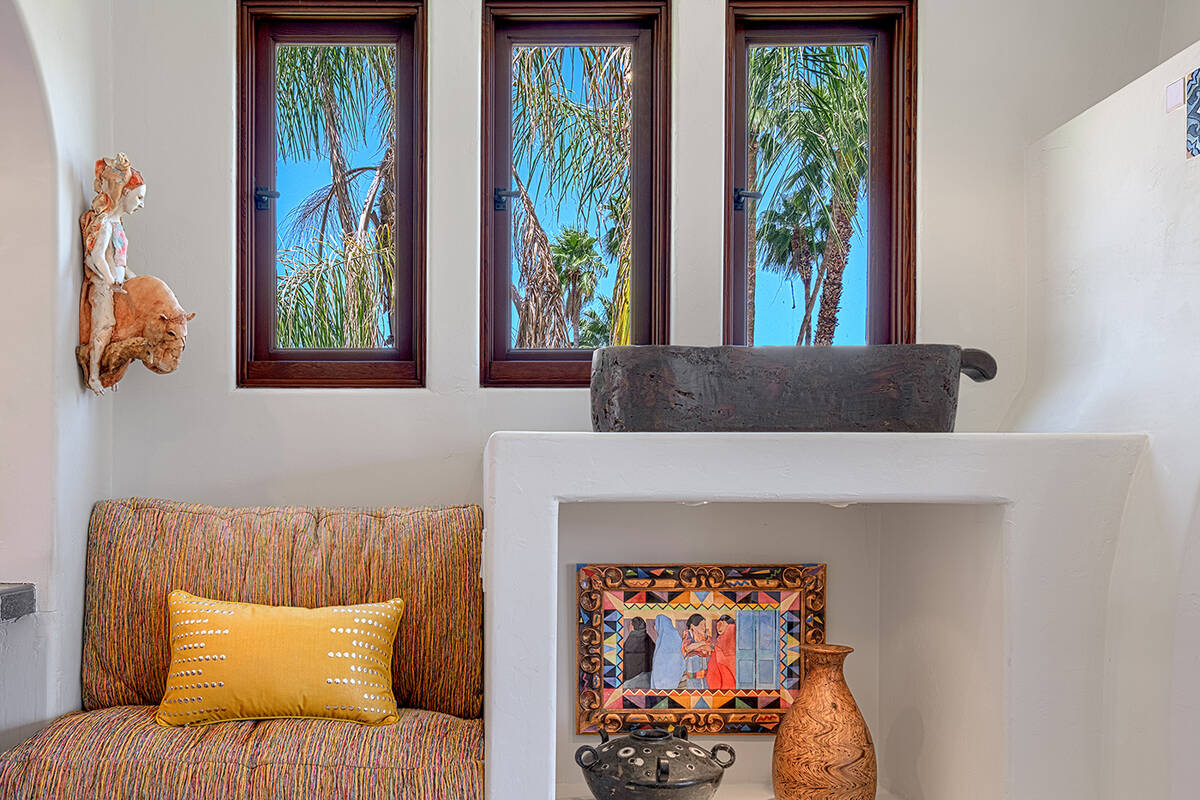 Situated on roughly a quarter-acre lot, the home underwent substantial improvements in the 1950s, upgrading and expanding the indoor living quarters while giving it a Moroccan-inspired facelift with Moorish-inspired accents throughout. The estate features four bedrooms, four baths, a three-car garage, two kitchens, an attached casita, multilevel patios and a resort-style yard.