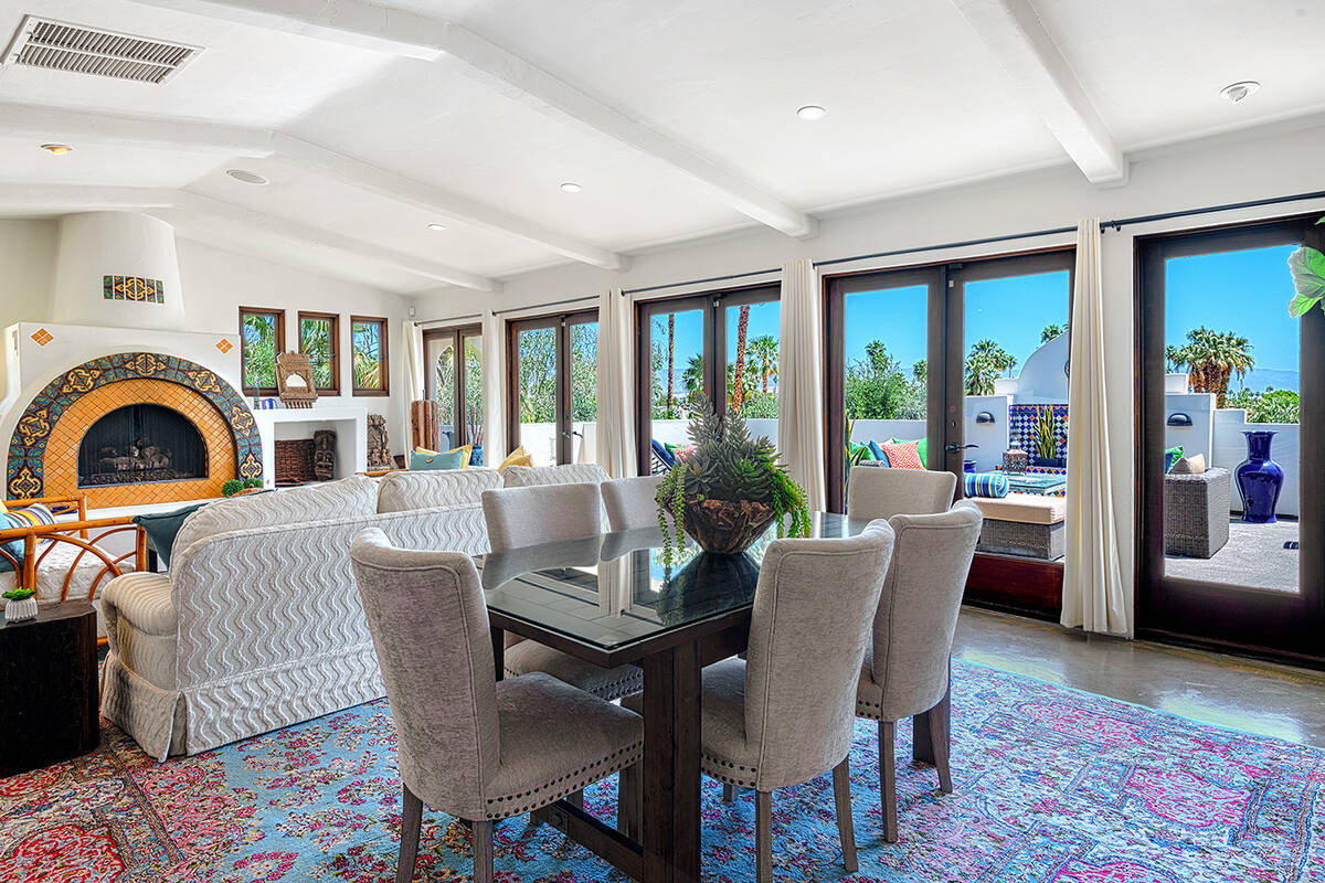 Enclosed by private iron gates, the Palm Springs getaway welcomes guests through a secluded courtyard and outdoor seating lounge, which leads to the upstairs main entry. Once inside the 3,306 square feet of indoor living space, the grand foyer guides residents into the formal dining and living room. Lined from wall to wall with French doors, the living room grants seamless access to an expansive second-level patio.
