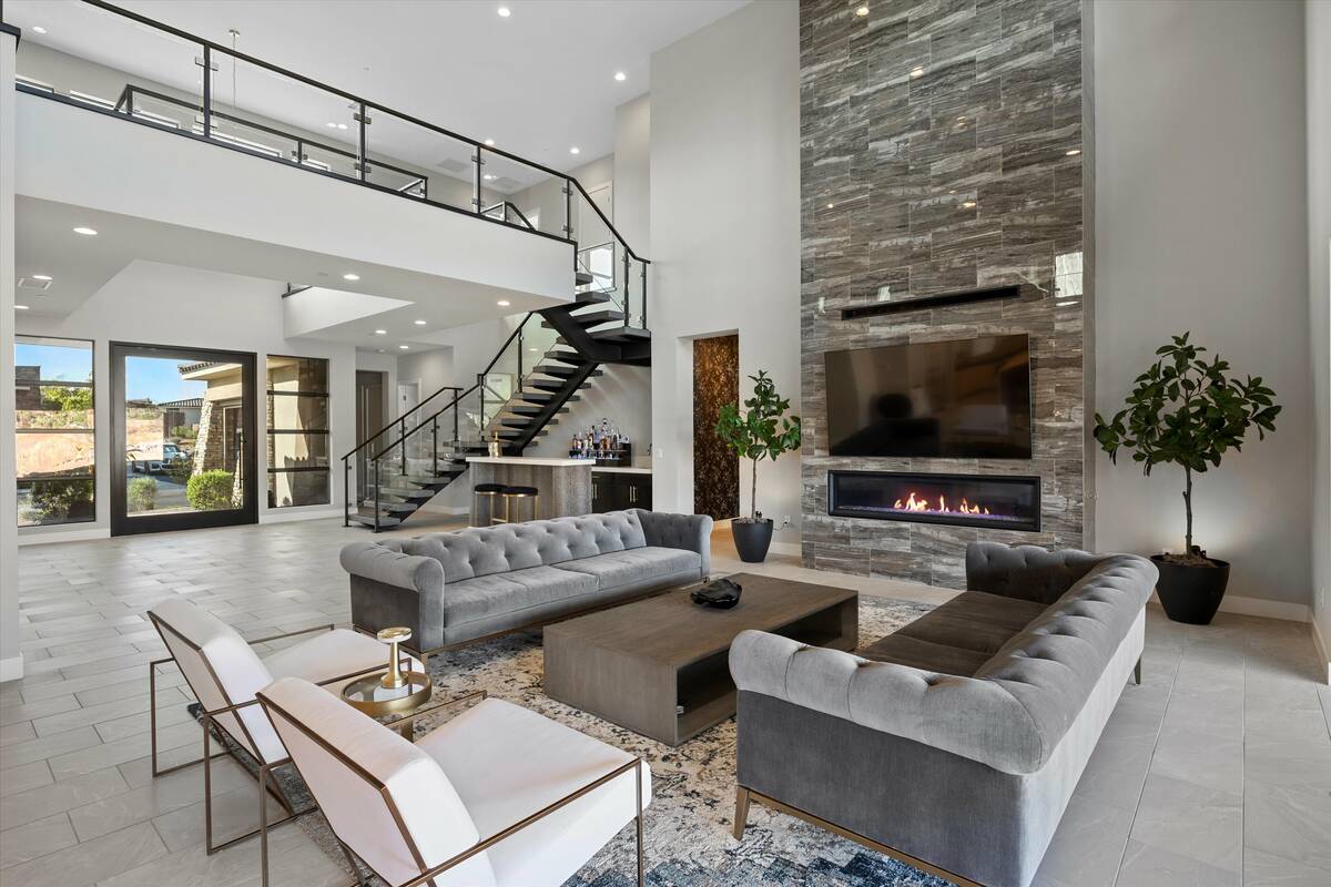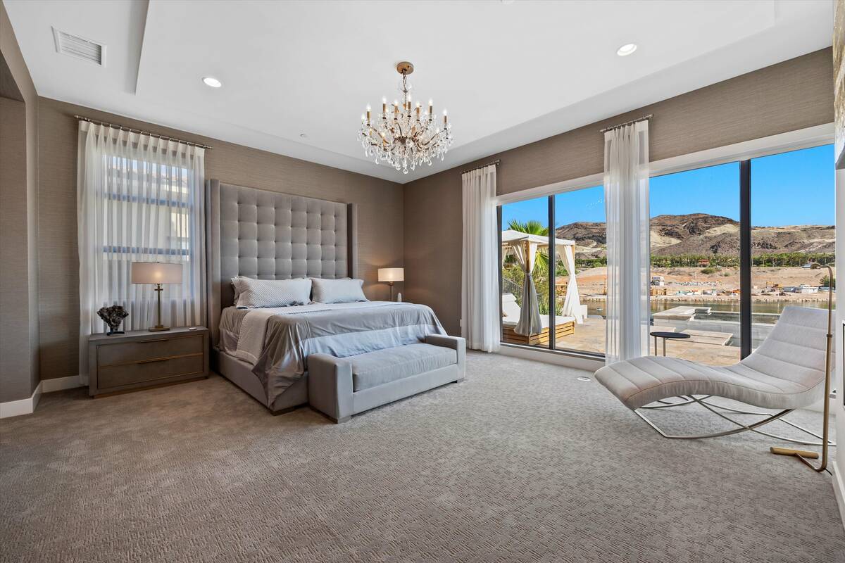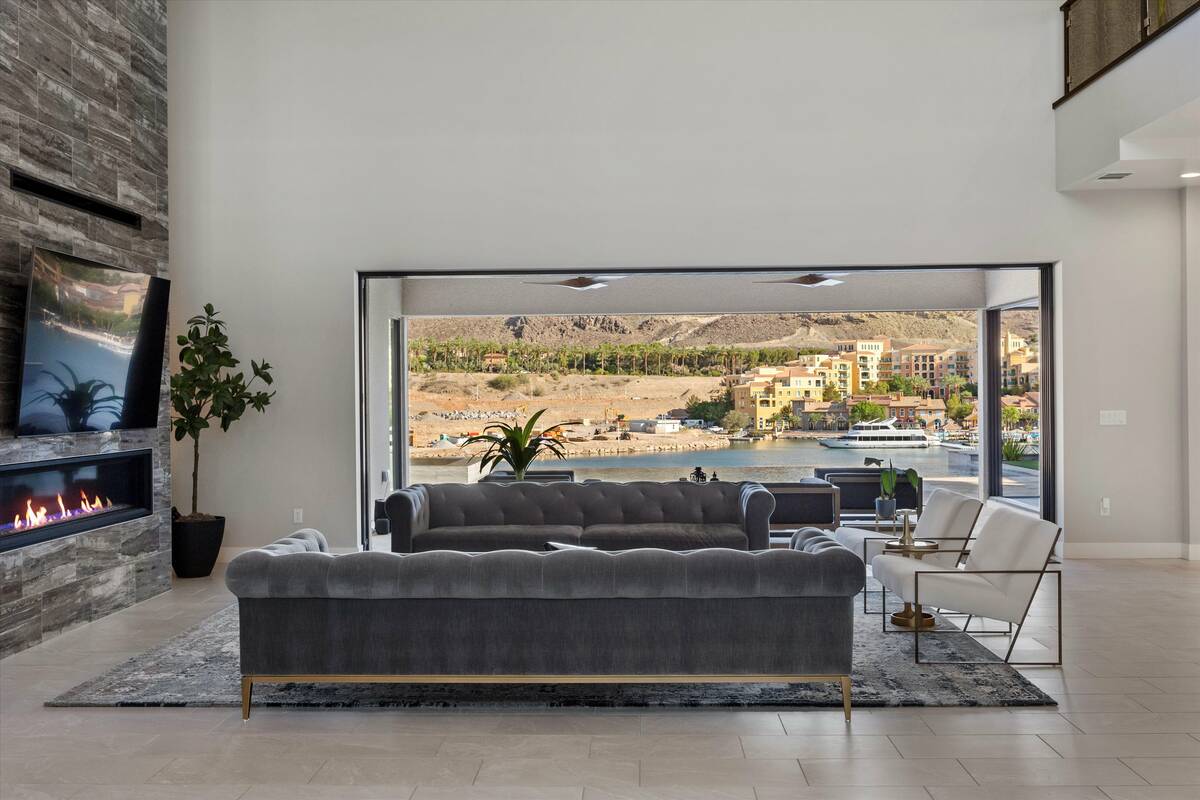 Entry to the home is itself a statement, through a spacious foyer and wet bar area that leads to a generous gathering space (great room) of high volume and expansive disappearing glass walls. This pairs with enormous views through the covered veranda, across the infinity-edge pool with spa, cabana, outdoor kitchen and sunken fire pit, then on to the inviting blue waters of Lake Las Vegas itself.