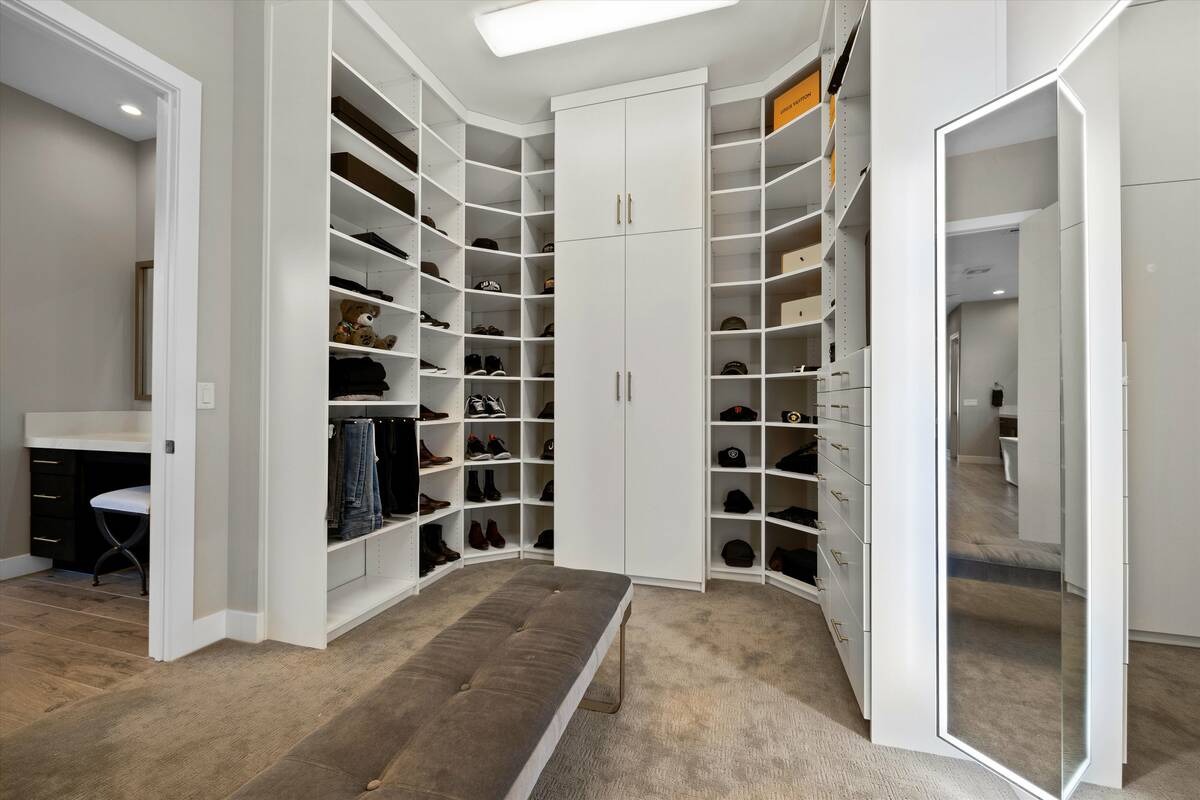 And certainly not to be left out is the spacious three-car garage with glass-front garage doors, built-in cabinetry, epoxy floors, shelving and an electric car charger.
