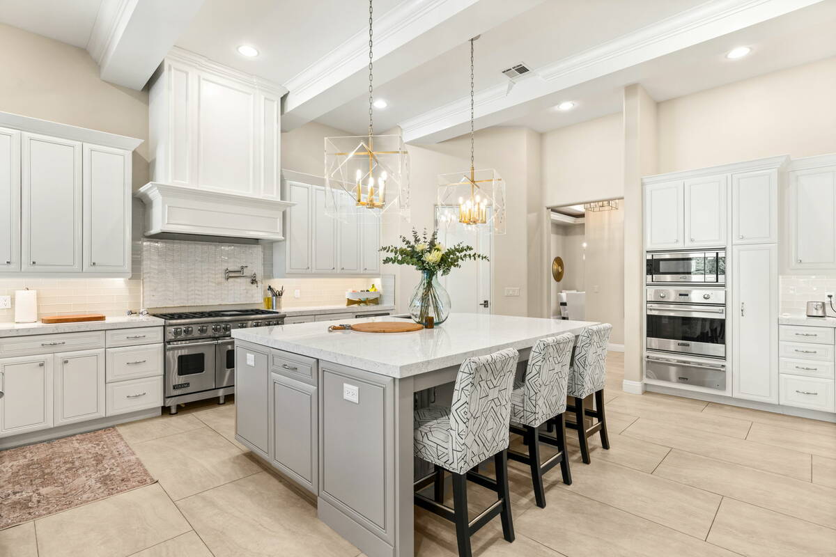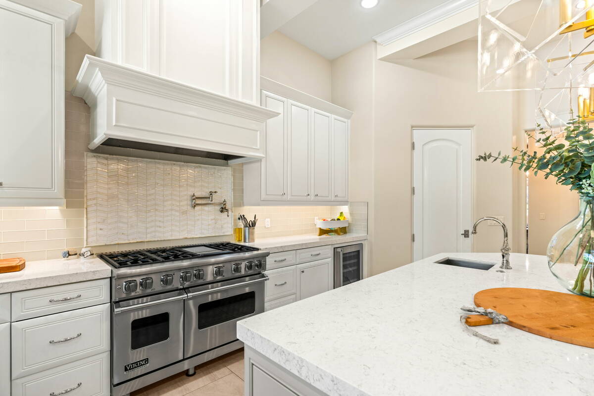 Just steps away is the chef’s kitchen with custom white cabinetry and built-in lighting underneath, stainless steel Viking appliances and white marble countertops. The oversized island is complimented by a chevron and subway tile backsplash and a spacious walk-in pantry. Across from the kitchen is a breakfast nook with a garden window that offers views of the backyard.