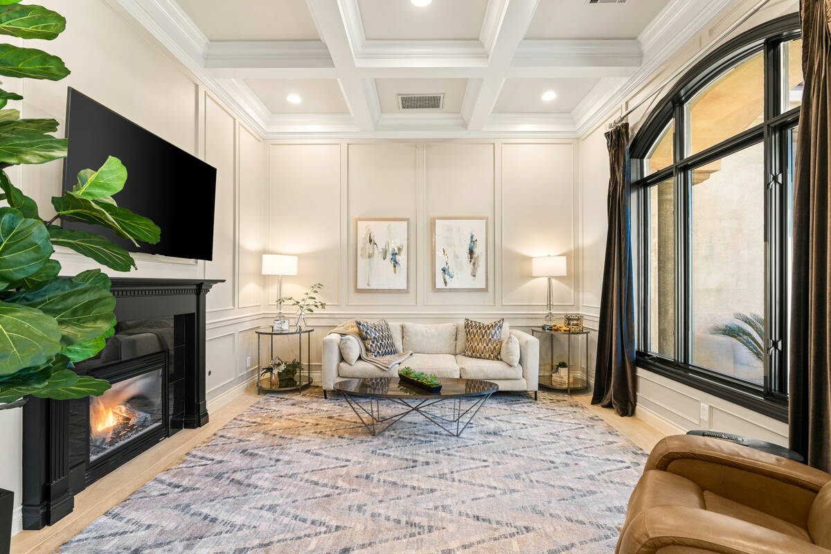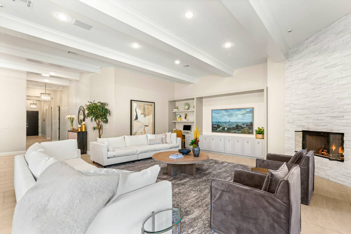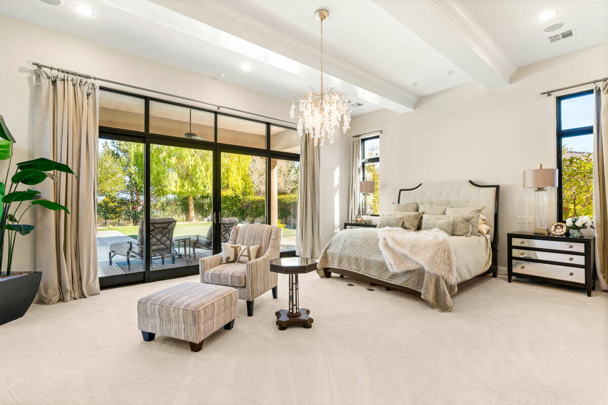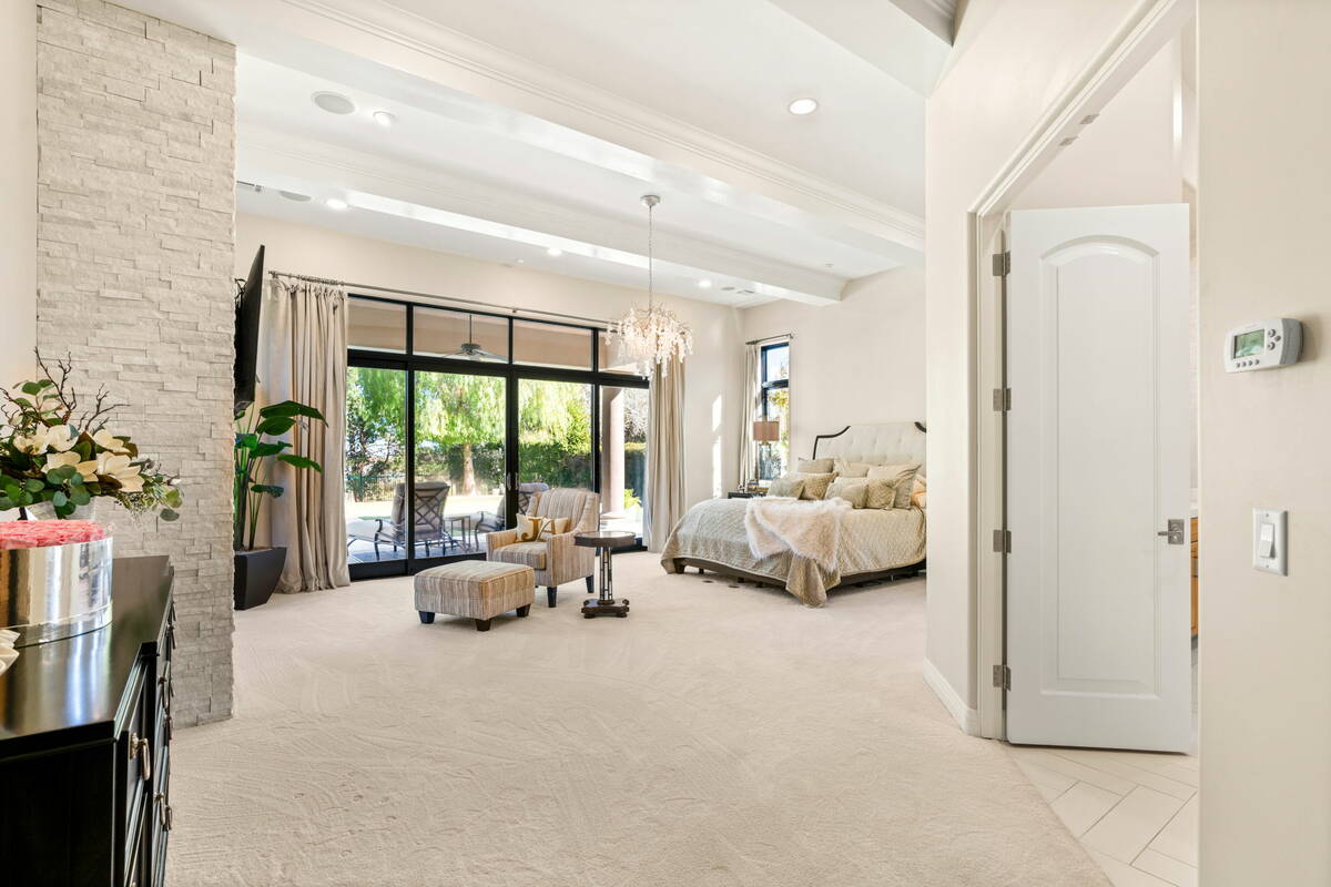 The primary bedroom offers private access to the backyard through sliding pocket doors, a floor-to-ceiling custom stone fireplace and a sparkling chandelier. The walk-in closet includes custom built-in shelving. Its spa-like bathroom exudes luxury with double built-in vanities that include ample storage, mirrors placed throughout, a stand-alone soaking tub with a window view and a tiled steam shower with a rainfall showerhead.