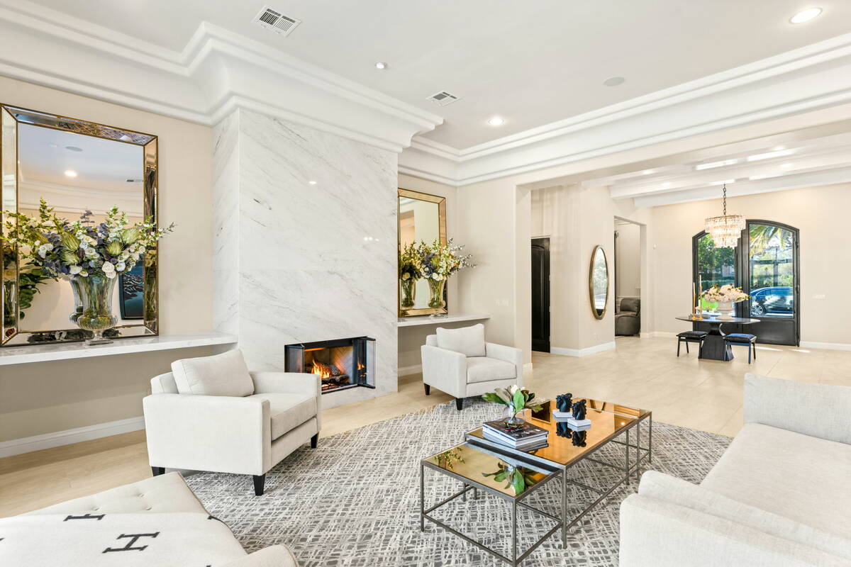 Craftsmanship is evident in every corner, including intricate stone and tile work, 12-foot vaulted ceilings adorned with crown molding, paneling and multiple chandeliers throughout. The secondary living area includes a floor-to-ceiling marble fireplace and an open layout.