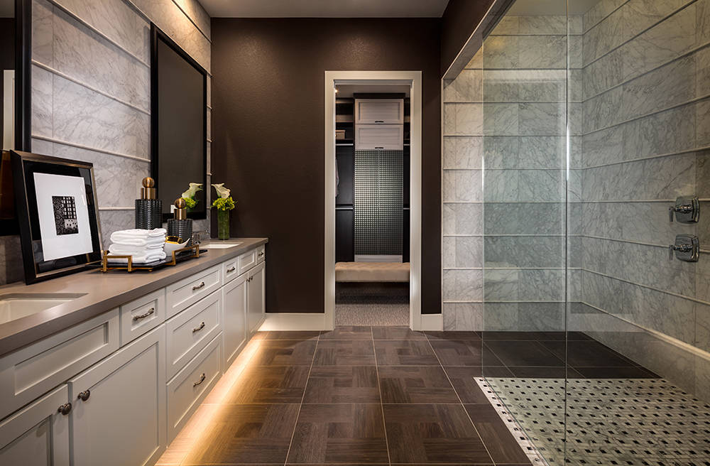 The kitchen has abundant cabinet and counter space, and it features a large center island and walk-in pantry. The master bedroom includes an enlarged closet and a spa like master bath. There’s a tucked-away pocket office. Other highlights include a covered entry, formal dining room, den with a columned entry, large great room with sliding door access to the covered patio and a secondary bedroom with a private bath. Marble Bluff was designed for Toll Brothers by architectural firm KTGY, and the model was merchandised by CDC Designs, said Dan Wright, Toll Brothers Las Vegas Division vice president.