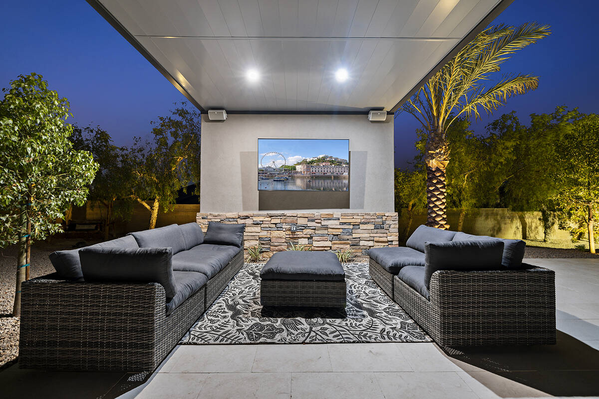 Designed for entertaining, the resort-style backyard provides guests with a fully equipped detached casita featuring a kitchenette, bedroom, bathroom, dining area and living space. Just steps away from the casita is one of two outdoor movie theaters with sunken wraparound seating, a fireplace and an extended patio cover.