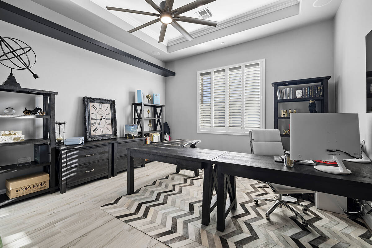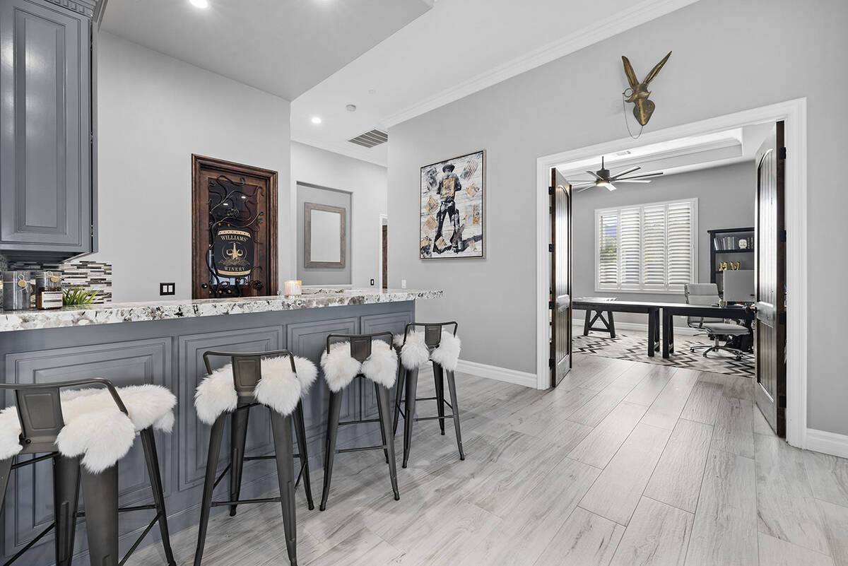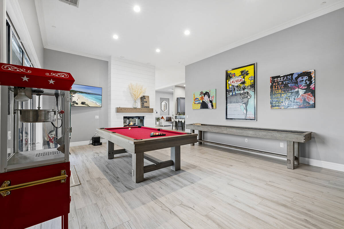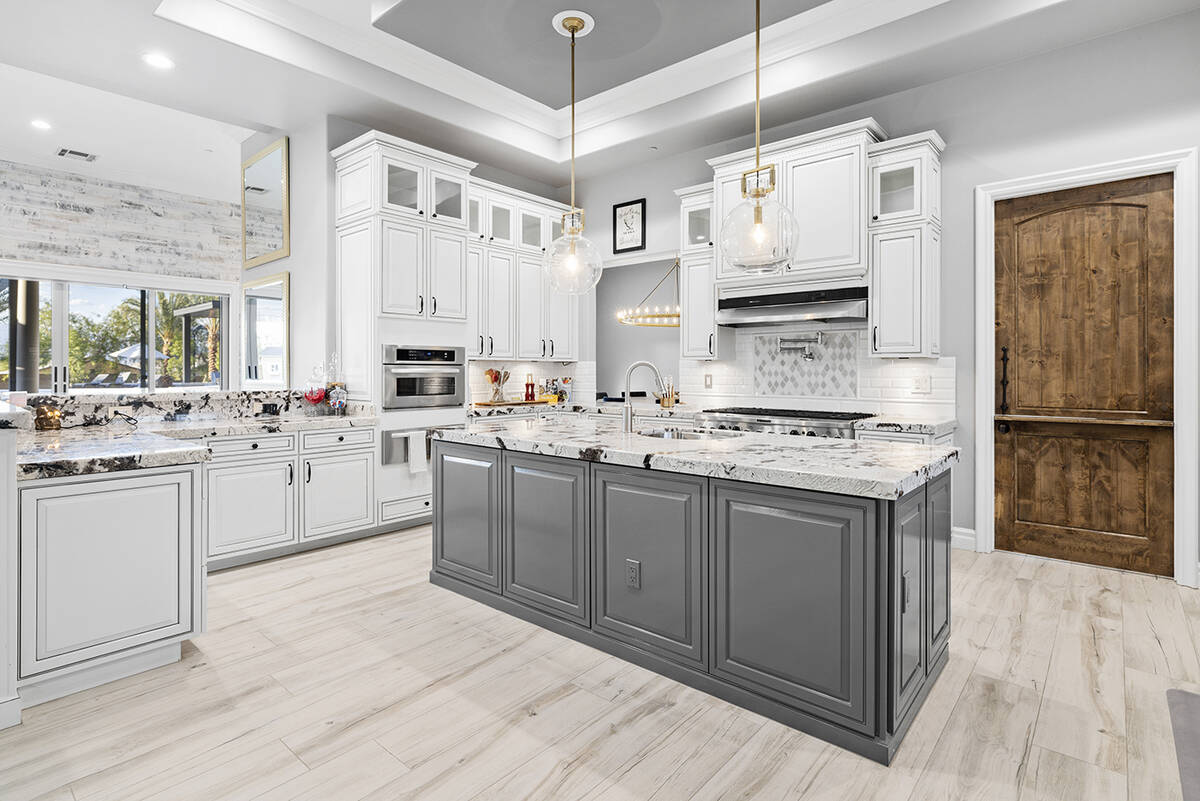 The kitchen’s modernistic design offers stainless steel appliances, white polished cabinetry, granite countertops, dual ovens, a built-in warming drawer and a wraparound island with extensive seating. Next to the kitchen, there’s an open-concept formal dining room in addition to a game room, an enclosed private office, a separate living area for the secondary bedrooms and a workspace nook, Napoli said.
