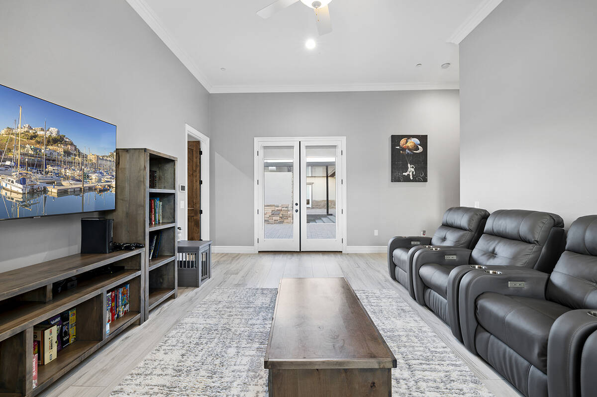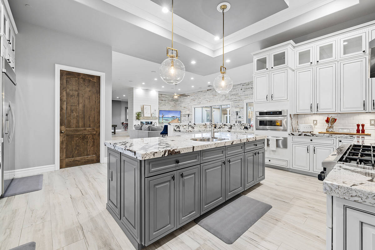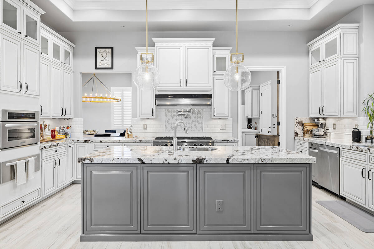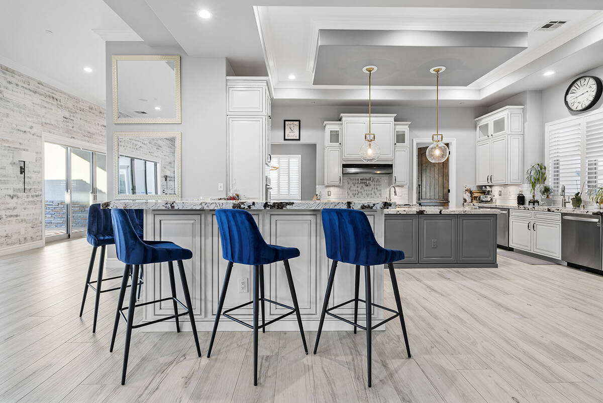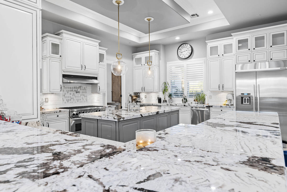 The kitchen’s modernistic design offers stainless steel appliances, white polished cabinetry, granite countertops, dual ovens, a built-in warming drawer and a wraparound island with extensive seating. Next to the kitchen, there’s an open-concept formal dining room in addition to a game room, an enclosed private office, a separate living area for the secondary bedrooms and a workspace nook, Napoli said.
