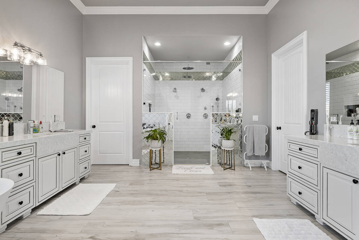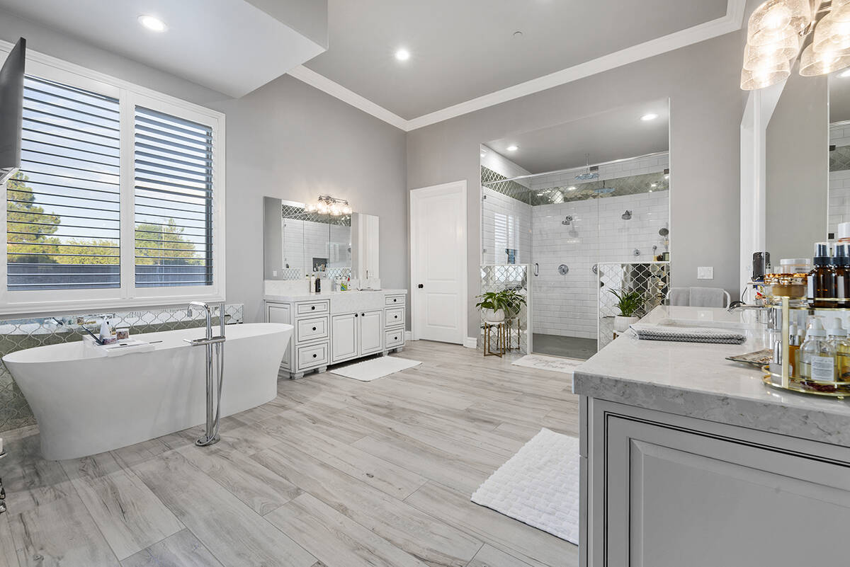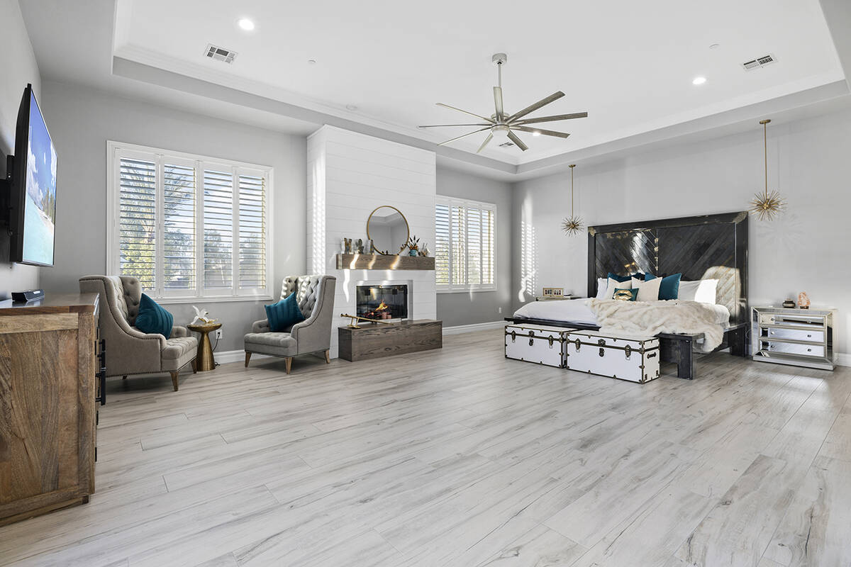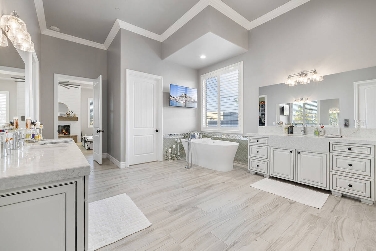 At the heart of the primary bedroom is a custom built-in wood fireplace accented by tray ceilings and a lounge area. Across from the fireplace is the walk-in closet and spa-like bath, showcasing a wet room with four showerheads, dual sinks with marble countertops and a freestanding soaking tub, Napoli said.