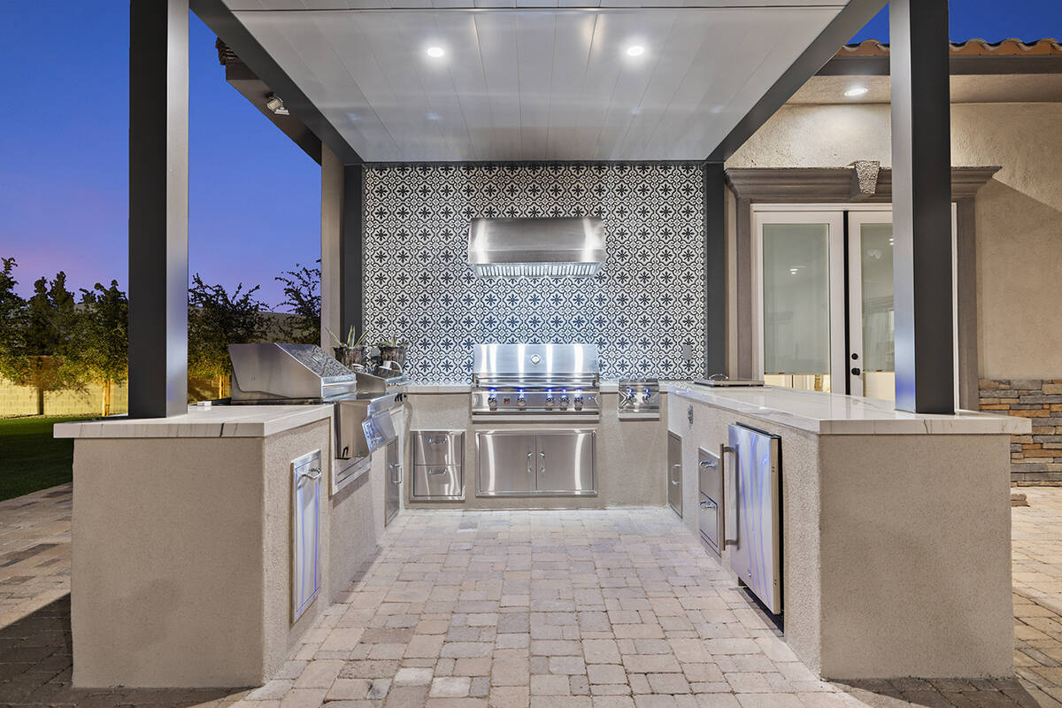 The backyard oasis also features a centerpiece pool and spa, basketball court, spacious lounging areas and an outdoor kitchen with dual stove tops.
