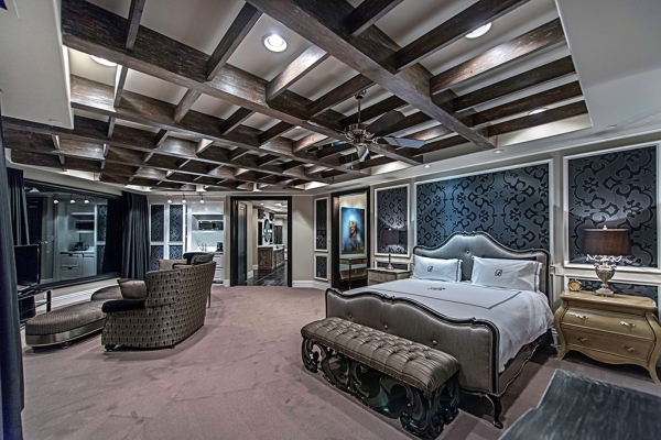 The upper-level master suite is modeled after the Mondrian Hotel in Los Angeles. Black patterned wallpaper framed with white molding contrast the walls. Reclaimed wood-beamed ceiling and plush carpet finish the elaborate room. Custom his-and-her chairs face the three large windows giving way to the grand view of the city.