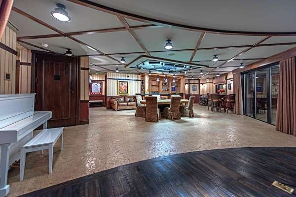 On the lower level, the hardwood 20-foot stage is designed into a dedicated game room. The game room is modeled after an Irish pub Jennifer visited in Amsterdam and includes a full bar with a double tap system. For recording, double glass on the window and door create a professionally sound proof room.