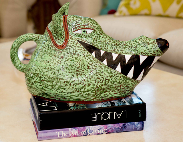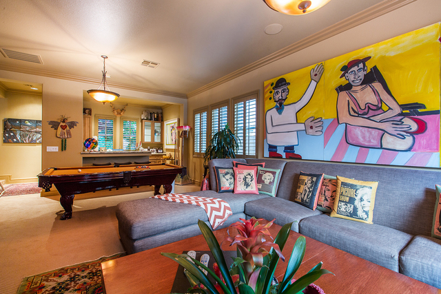 An avid and active fine art collector, Jones Blackhurst’s home’s interior greets visitors with a riot of colorful paintings and statuary. Some bear names such as Warhol and Hockney. It makes for a wonderful contrast with the outdoor panorama.