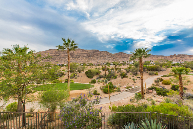 FEATURES: Master suite has balcony with views of Spring Mountains, large sitting area with fireplace, wet bar, large closet and bath; courtyard at entry; water features; game room; and casita. The home sits on the first hole of the Red Rock Country Club golf course.