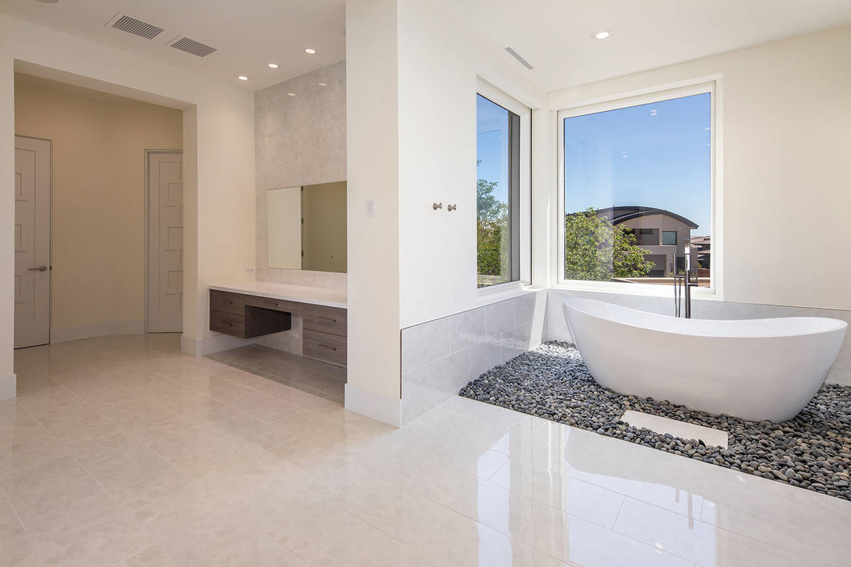 The master suite features a spa-like bathroom with an oversized shower and a soaking tub sitting on a bed of beach pebbles, she said.