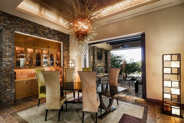 Back inside, the dining area is off the living room and is near a pocket door. It opens to a patio with a unique water feature that appears to be a curtain of running water.