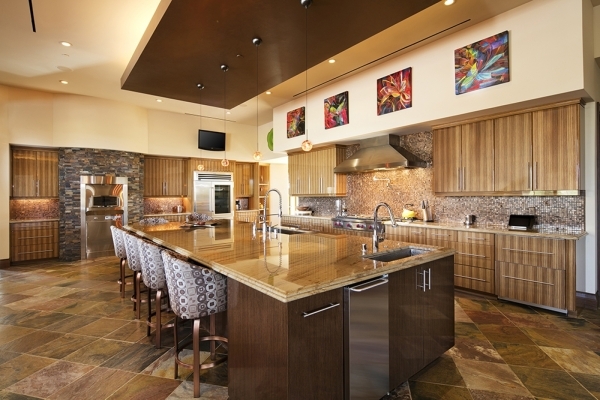 The kitchen features a large island with seating that looks out into the lounge bar which has lots of TV screens. It has upgraded appliances and a pizza oven. There is a breakfast nook in the back that connects with the backyard patio. A very large outdoor kitchen has seating for another 20 or so. Little gathering areas are designed throughout the backyard, which also houses a spa infinity-edge pool with a waterfall.