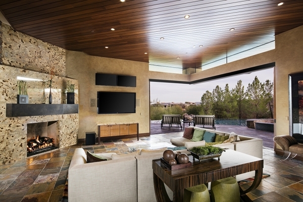 The floors are stone and run from the entry and living rooms into outdoor patio areas. It is a showcase of indoor-outdoor living with pocket doors sliding away to connect spaces. the office at the right of the lower level features two walls that open into a patio.