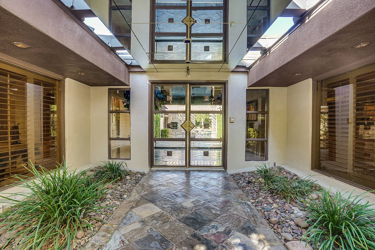 A grand double-door glass entry leads into the home’s formal foyer, with views of the lush backyard revealed through a door on the opposite side.