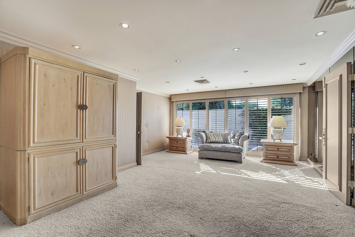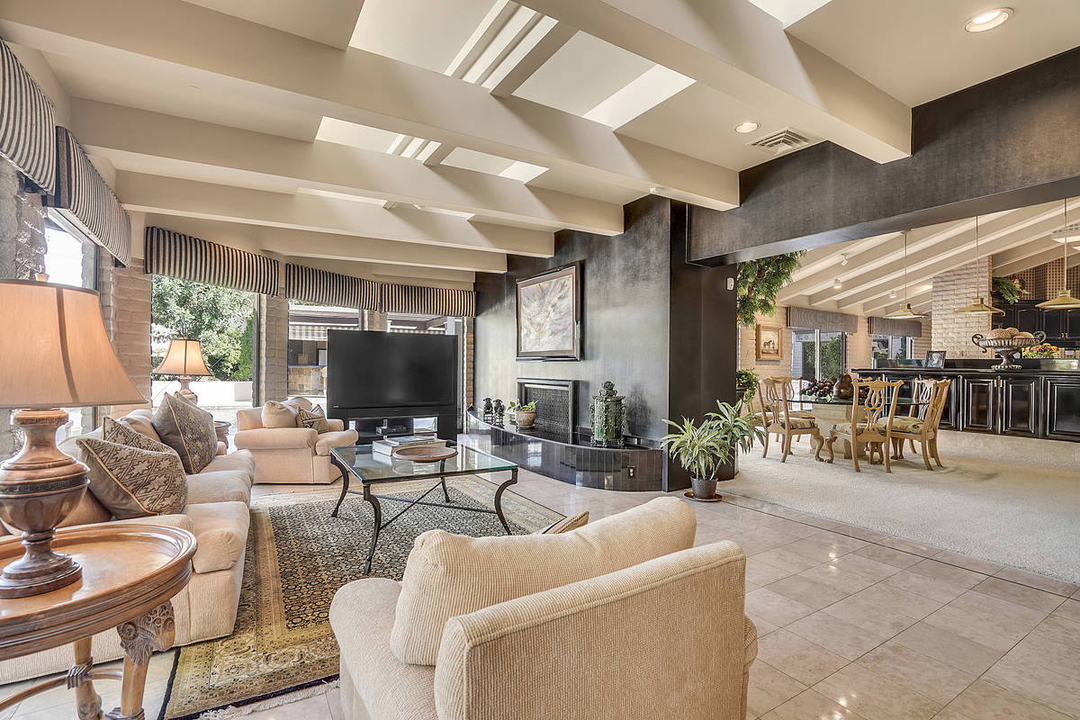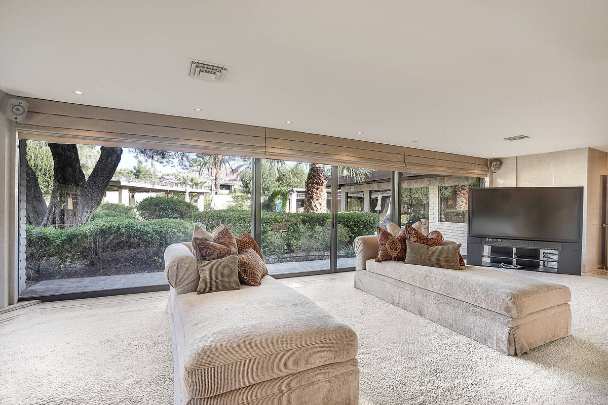The main living area’s walls of windows and sliding glass doors open to the outside with views of the landscaped grounds and voluminous pool deck.