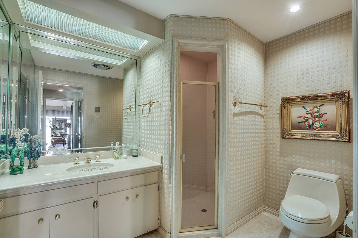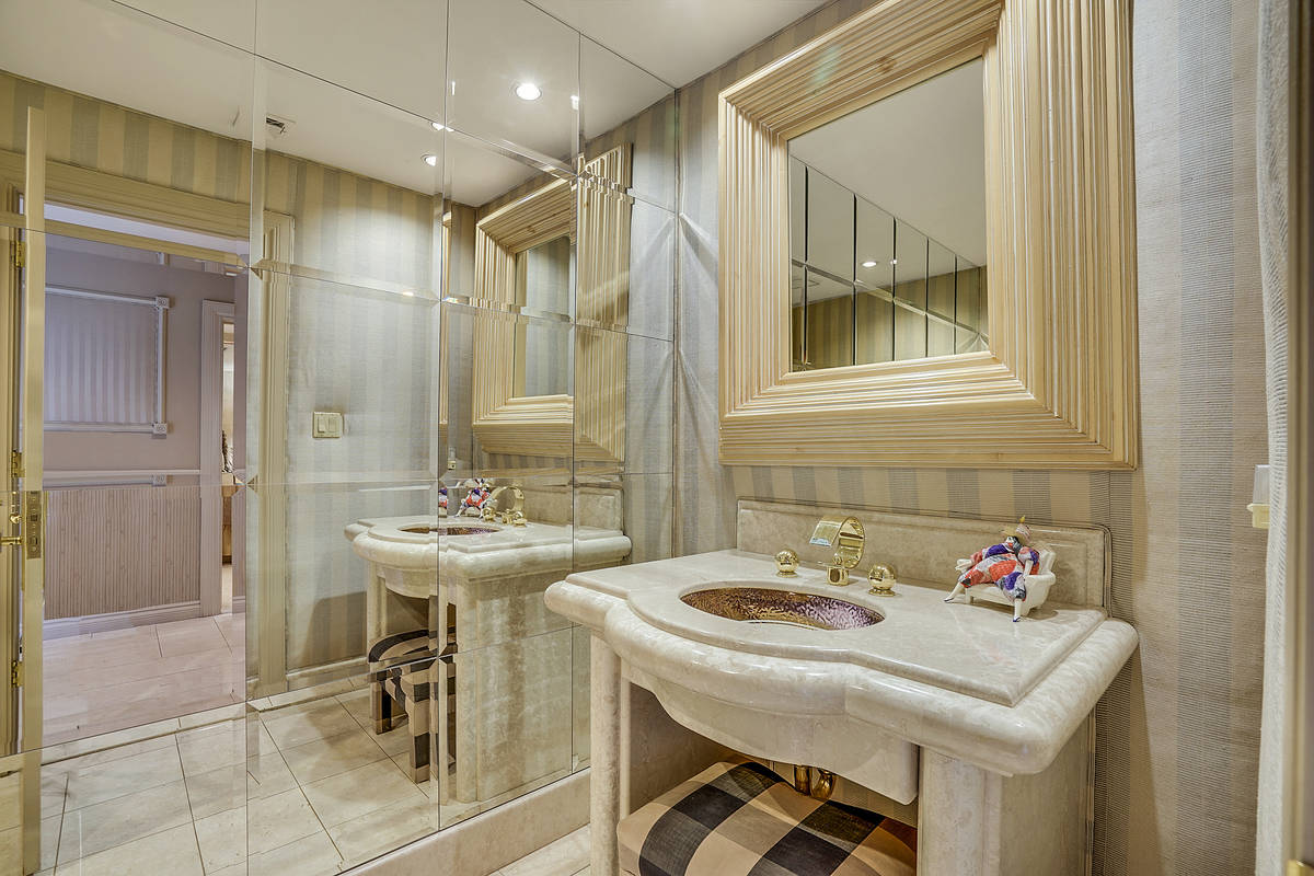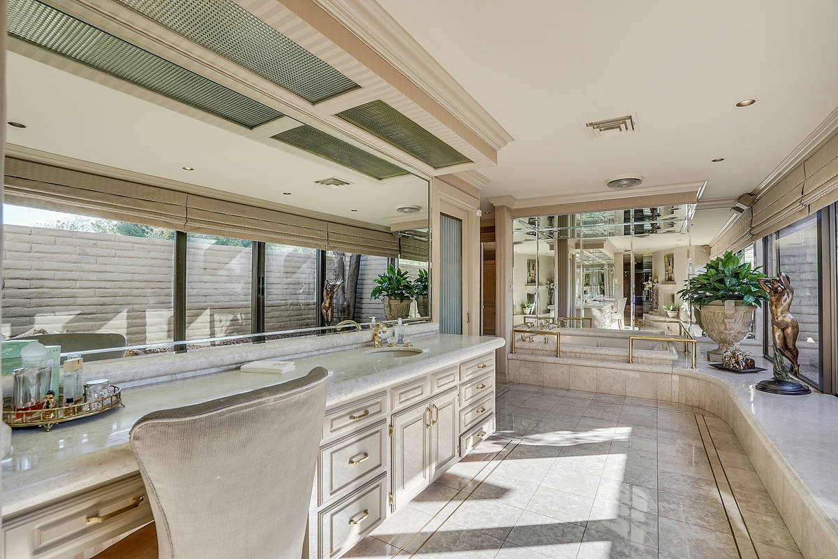 The opulent secondary master bathroom features a unique two-sided vanity, expansive glassless walk-in shower with marble surround and jetted tub.