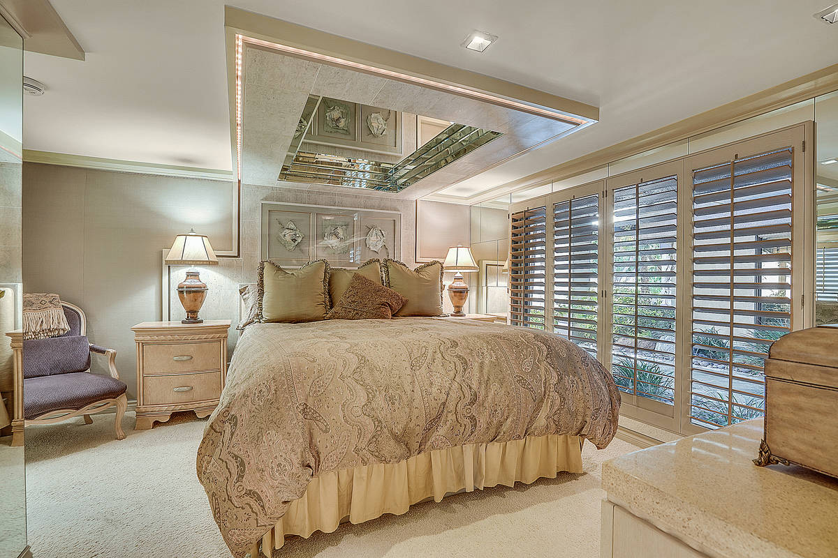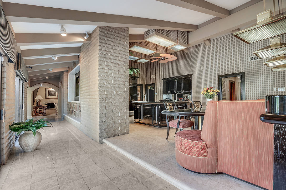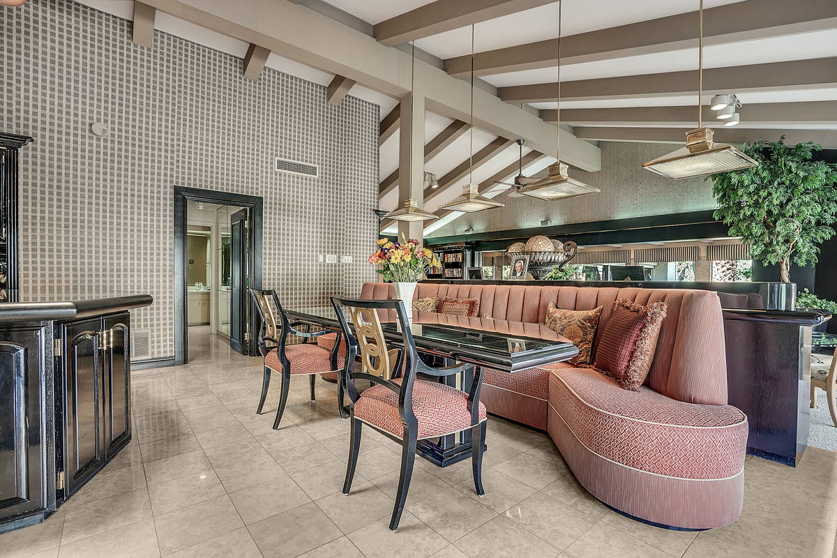 An iconic 1970s design feature, and focal point for the main living area, is the classic sunken bar lined with padded club chairs. The nostalgic, full-service black bar features a refrigerator, ice maker, sink with a built-in blender and plenty of storage.