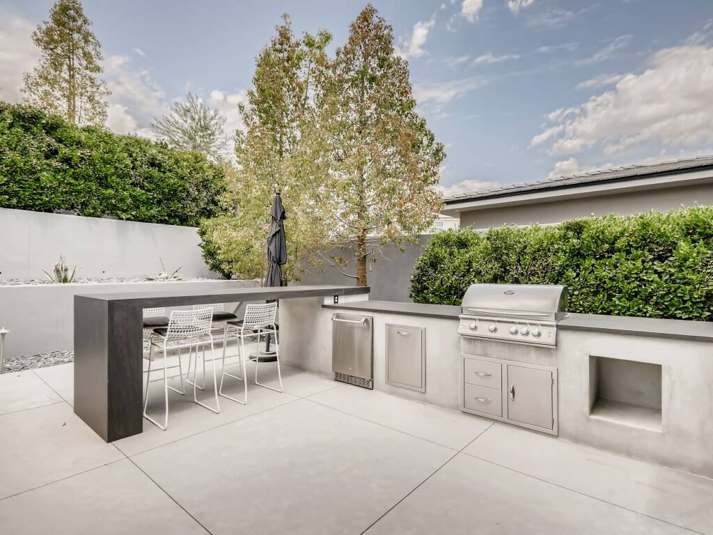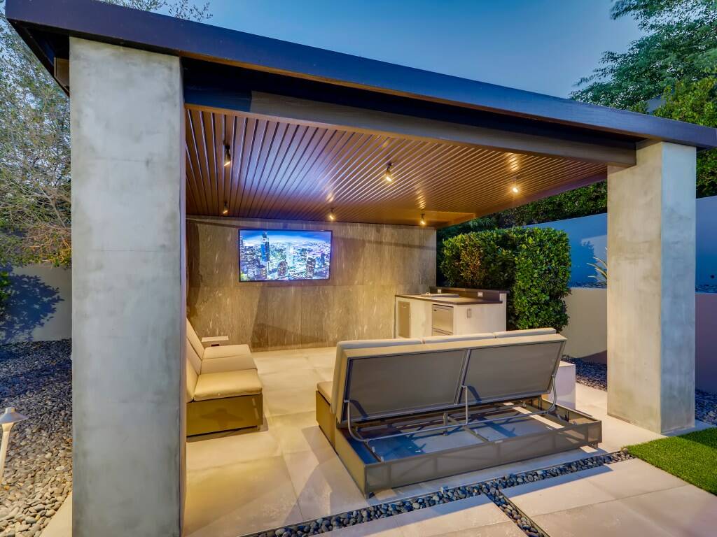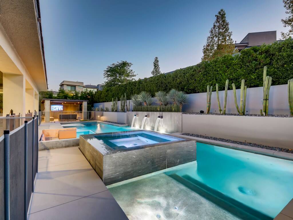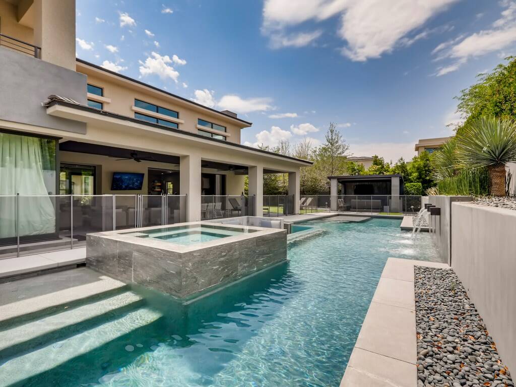 There’s a resort-style pool and spa with a custom fire pit lounge in the pool, covered patio with built-in barbecue area with table and a cabana with a built-in bar, the Realtors said.
