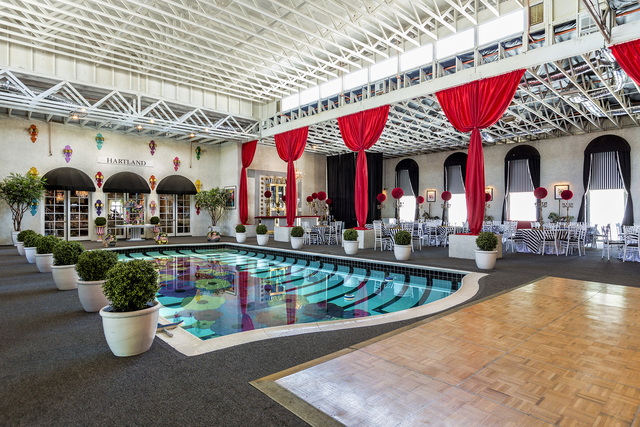 The “Grand Party Room” is the place for entertaining and a venue where hundreds of weddings, proms, bat mitzvahs, parties and charity events have taken place over the years. At its center is an indoor pool with tilework depicting bold black stripes and an abstract flower garden.