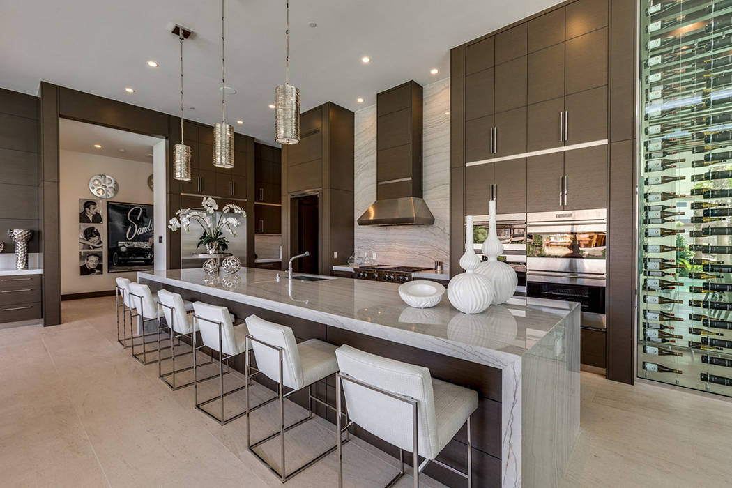 The finishes in the kitchen, which has a 14-foot ceiling, are Recon Walnut cabinets and Perla Elegante quartzite. There are Sub Zero Wolf appliances and Moca Creme limestone flooring.