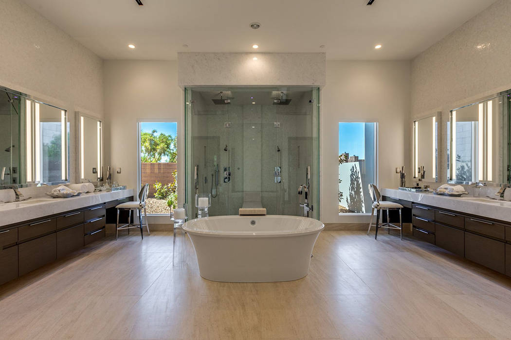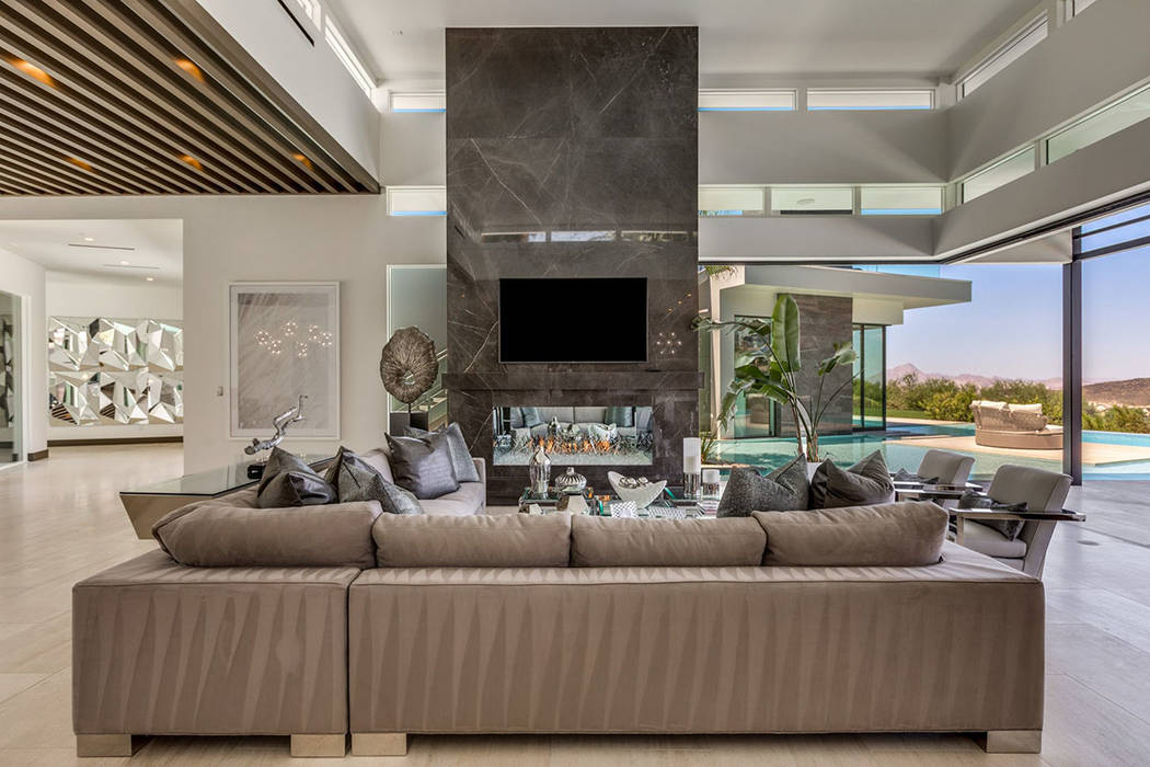 It’s designed as a contemporary home with tall ceilings as high as 20 feet and floor-to-ceiling fireplaces in the great room and master suite. The home has various pieces of one-of-a-kind, hand-cut stone and luxury marble walls. It features oversized limestone floors and walnut cabinetry.